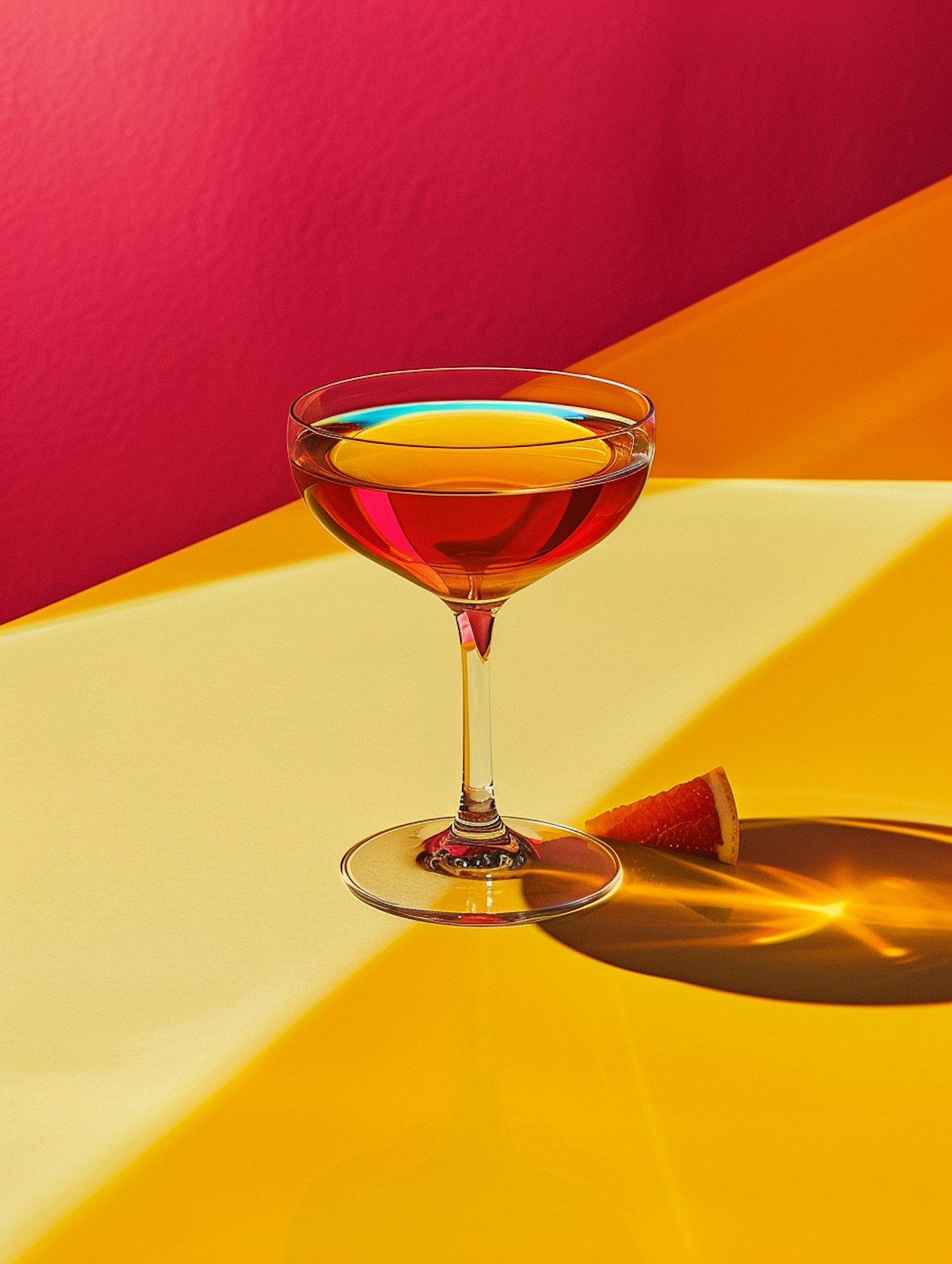 Vibrant cocktail in a clear glass on a yellow surface with a red-orange background, featuring a citrus slice.