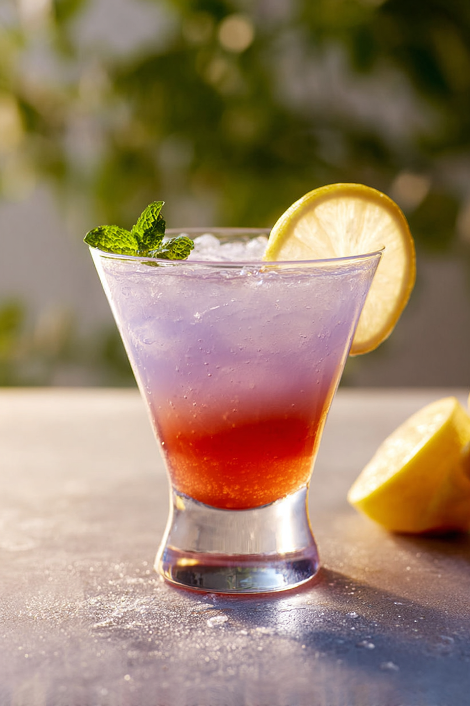 A colorful cocktail with a red-to-purple gradient, garnished with mint and lemon, set against a sunny, blurred background.