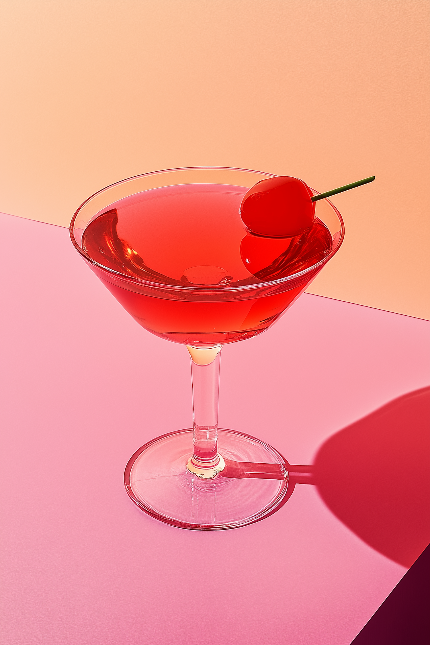 Bright red cocktail in a martini glass with a cherry garnish, set against a pink and peach gradient background. Modern and vibrant aesthetic.