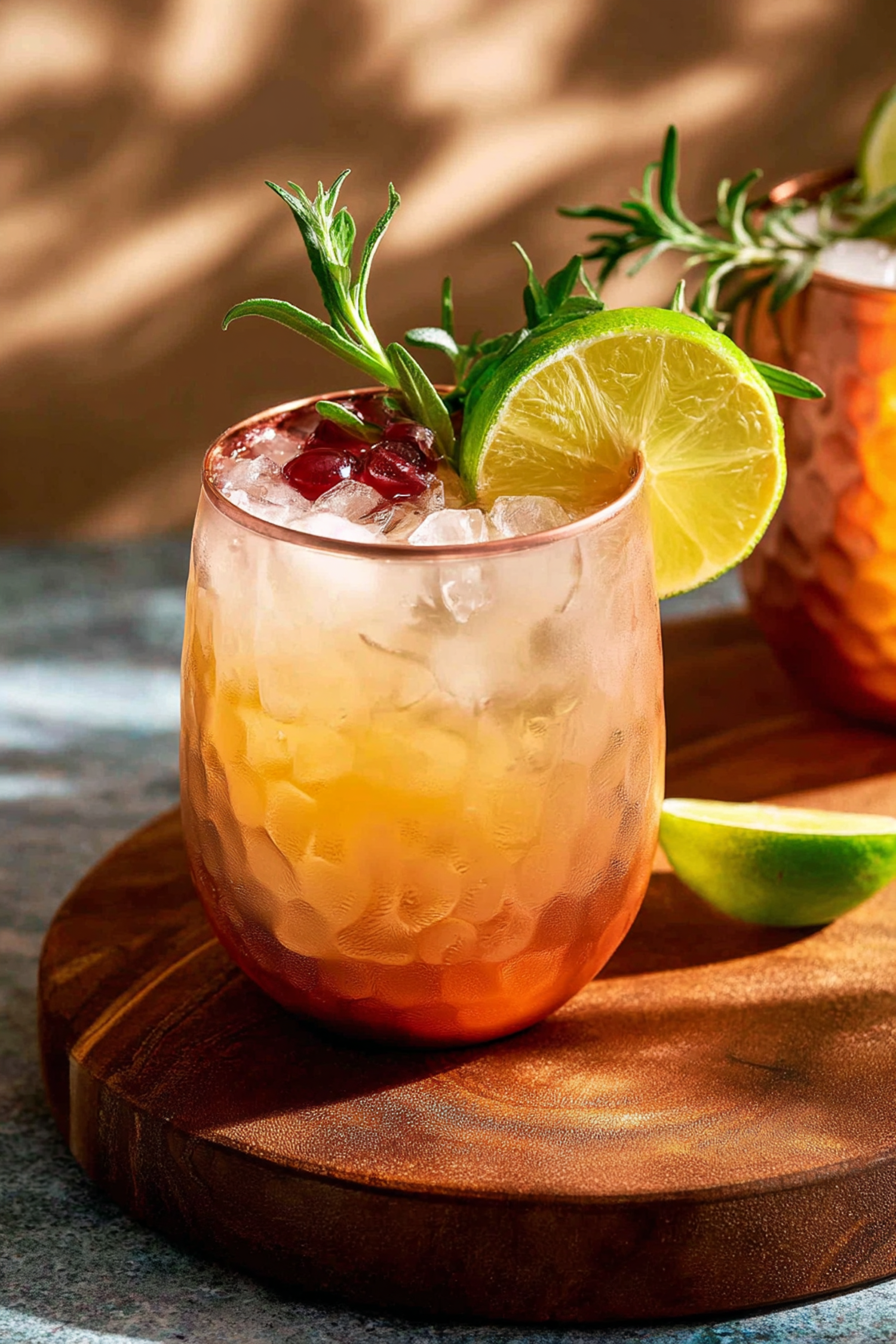 A refreshing cocktail in a textured glass, garnished with lime, rosemary, and pomegranate, set on a wooden surface with warm lighting.