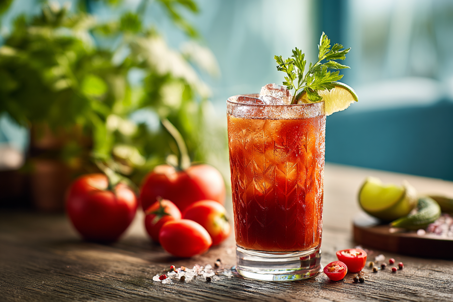 Refreshing tomato-based cocktail garnished with parsley and lime, surrounded by fresh ingredients on a rustic wooden table.