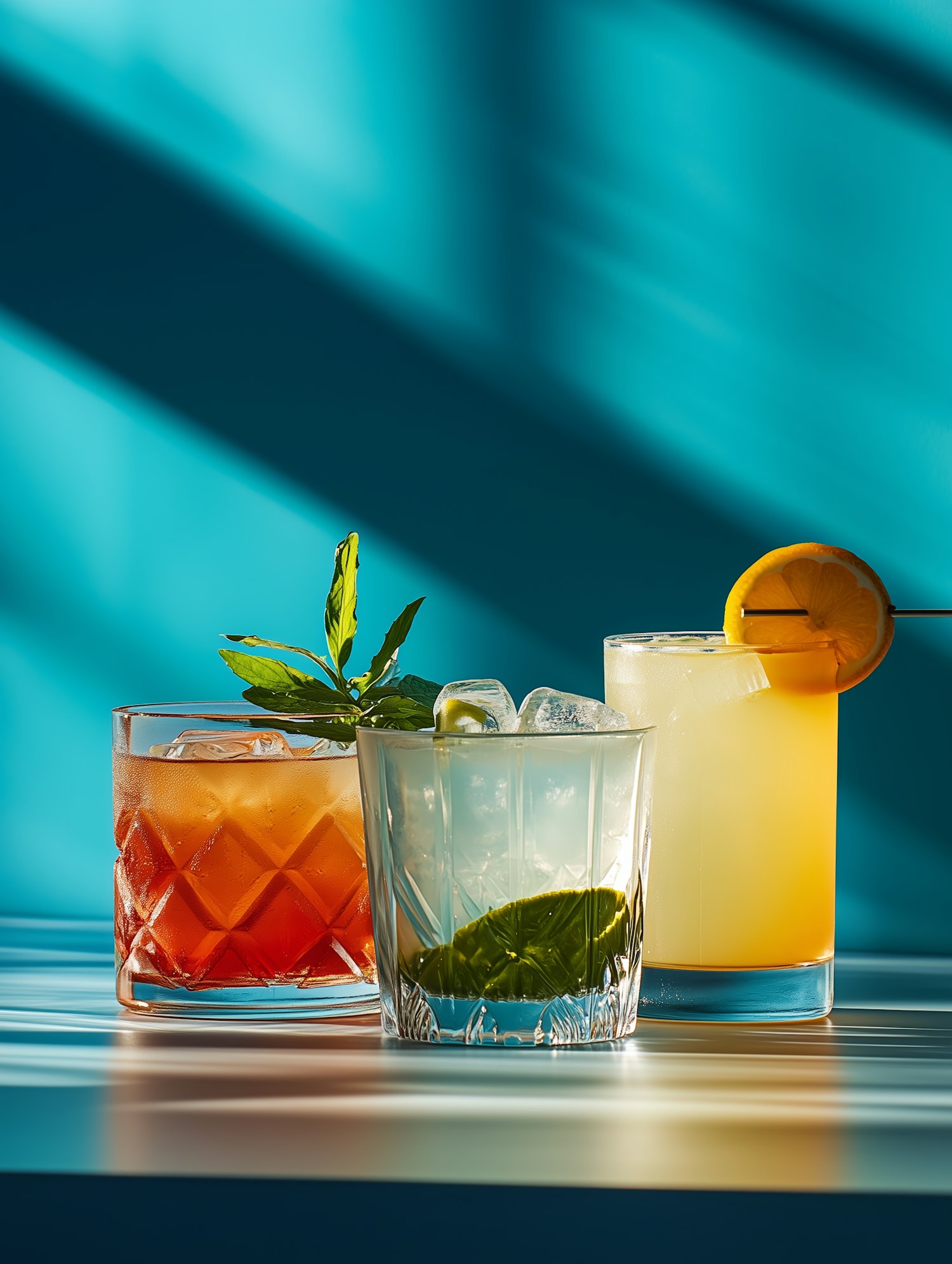 A trio of colorful cocktails on a reflective surface, featuring vibrant garnishes and dramatic lighting against a turquoise backdrop.