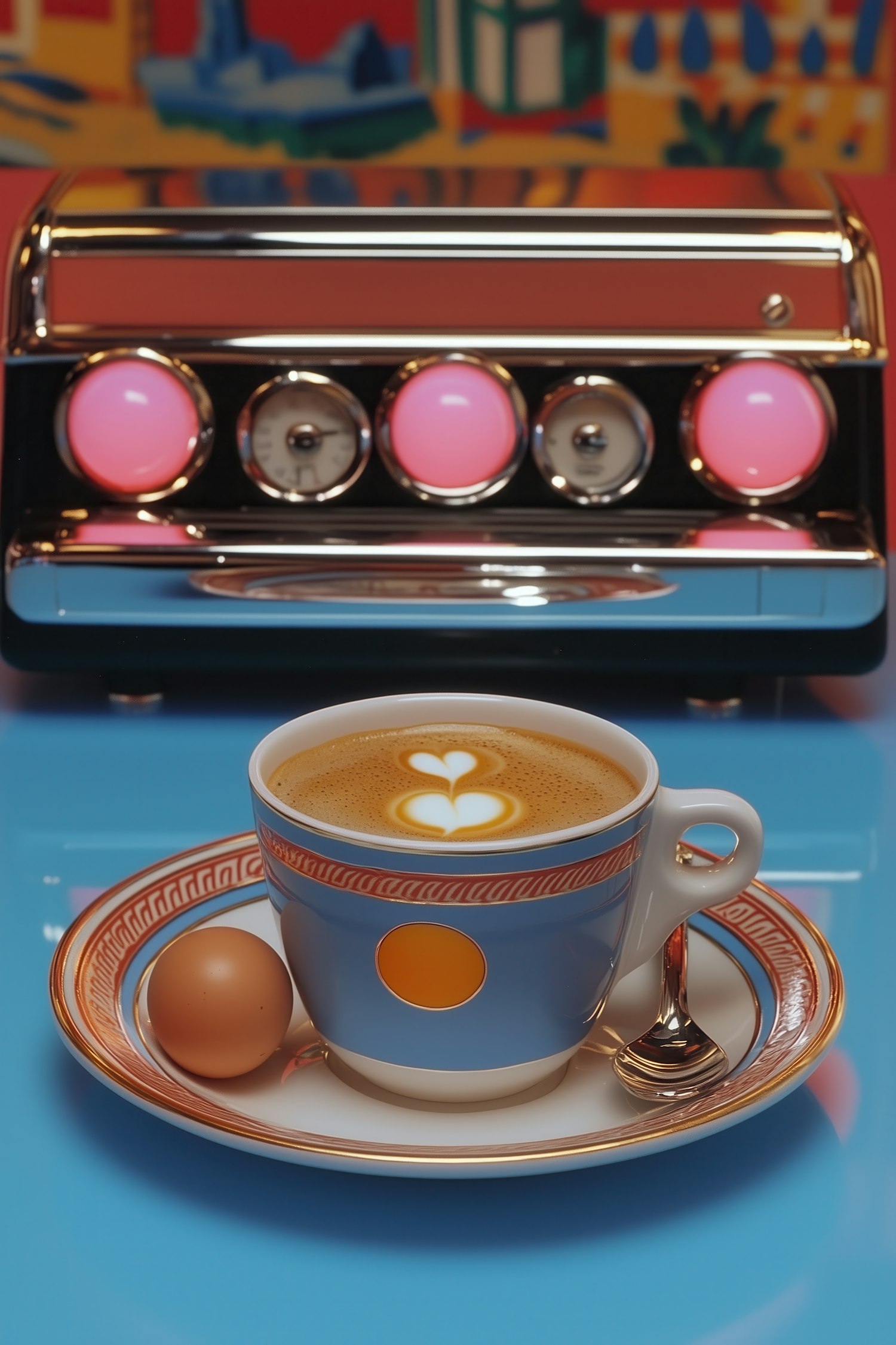 Retro coffee scene with latte art, blue cup, and vintage machine. Bright colors and playful design create a nostalgic vibe.