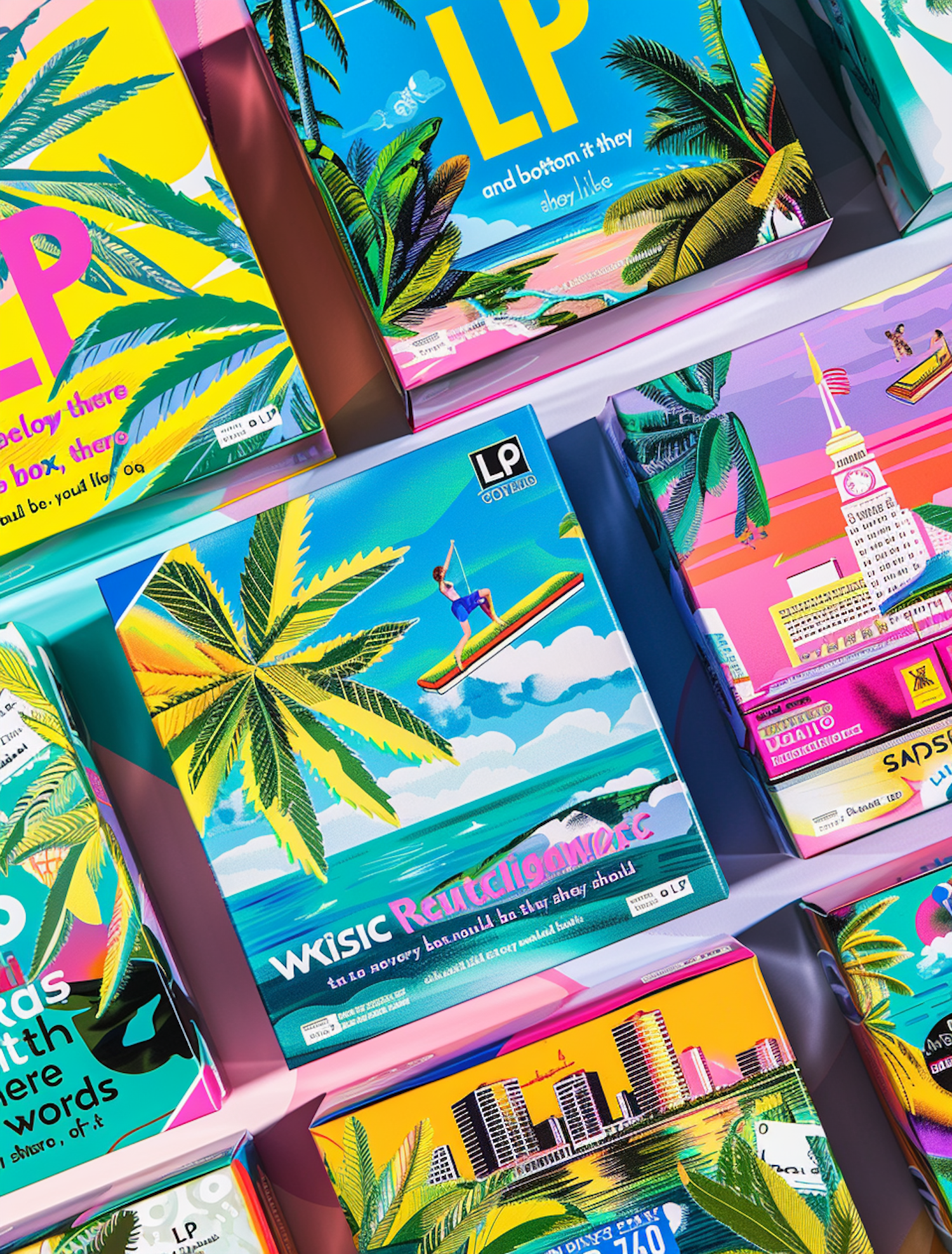 Bright tropical-themed LP covers with bold colors, palm leaves, and playful typography, evoking a retro summer vibe.
