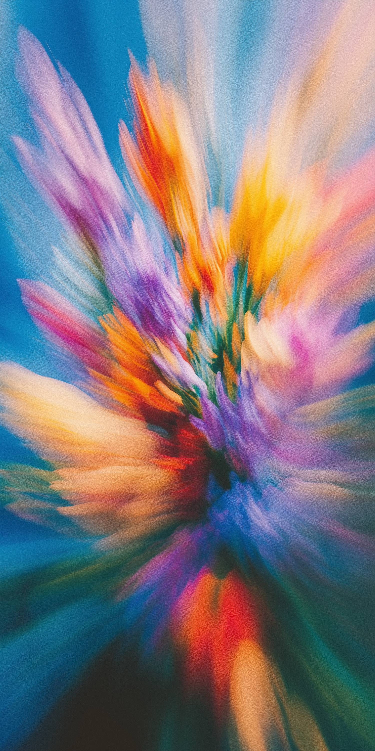 Abstract floral burst with vibrant colors of orange, yellow, purple, and pink against a soft blue background, creating a dynamic motion effect.