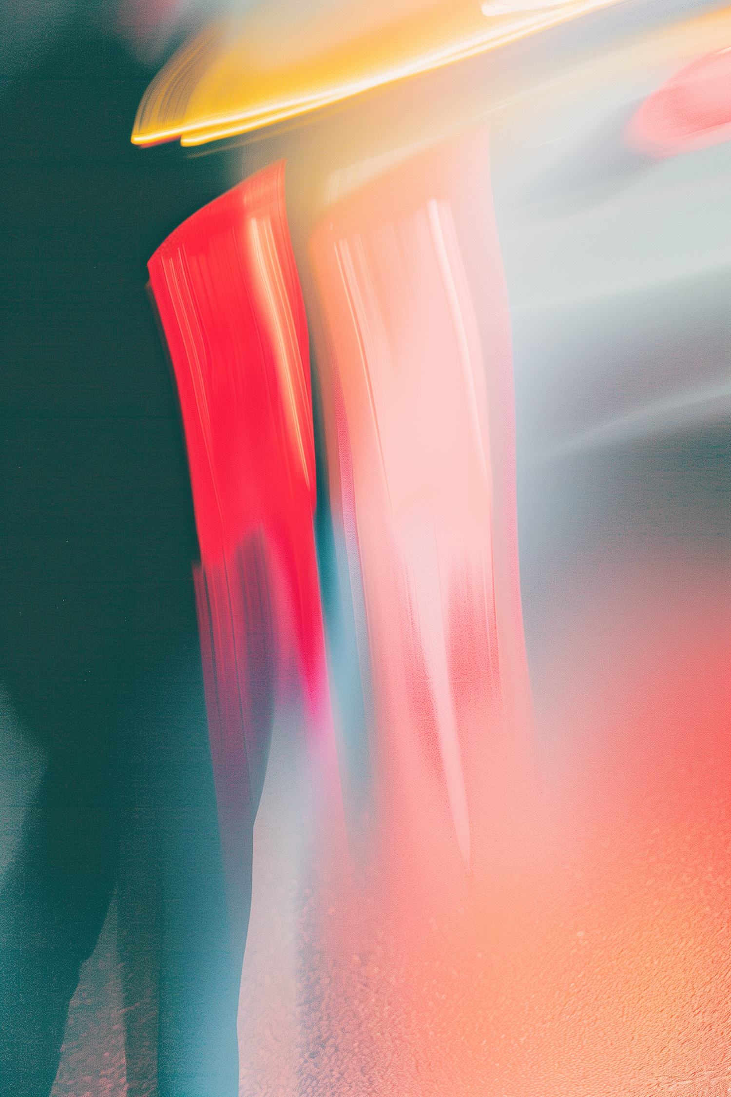 Abstract art with vibrant red, orange, and yellow streaks blending into soft pink and blue tones, creating a dynamic and fluid motion effect.
