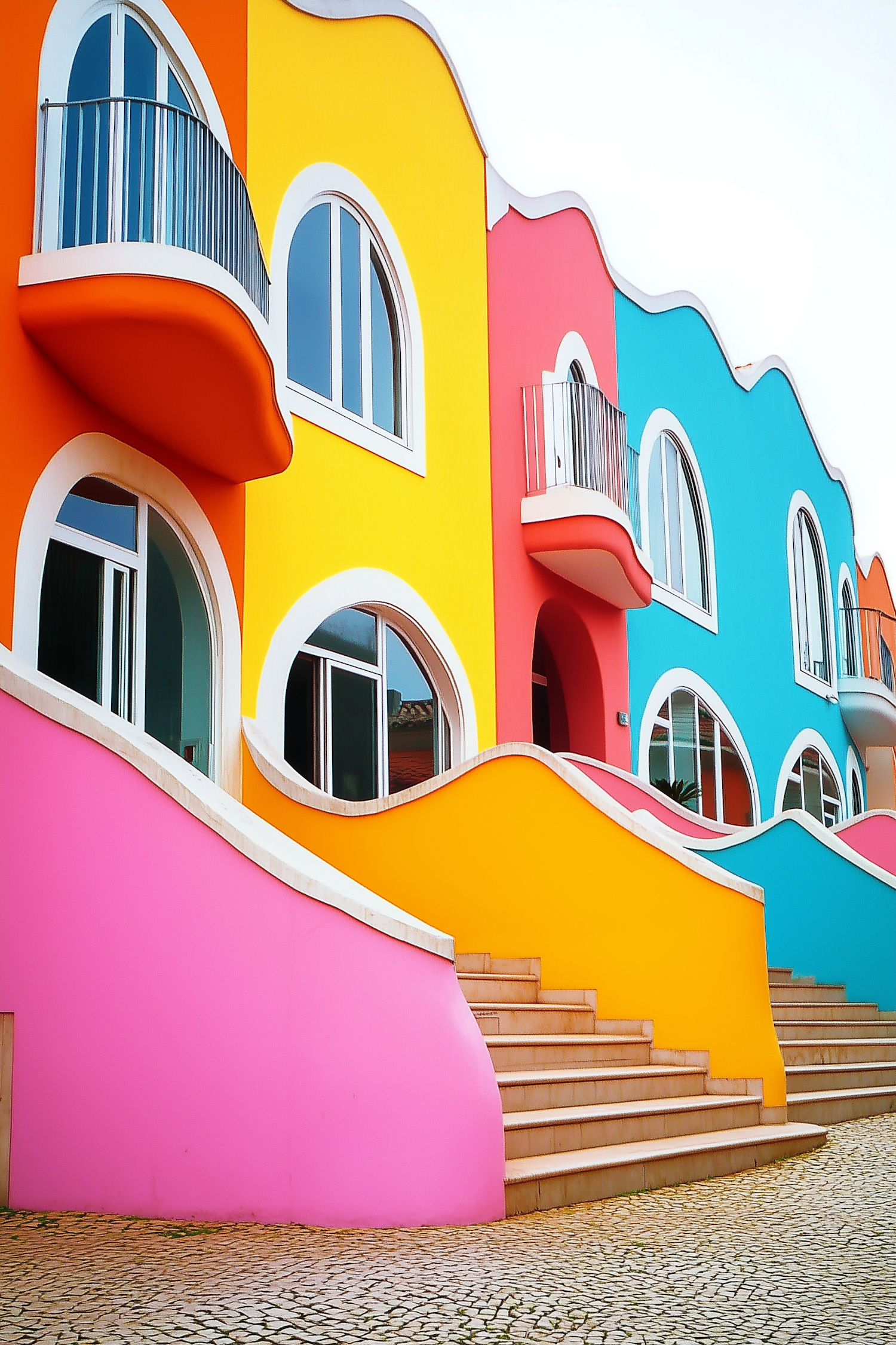 Vibrant building facade with colorful wavy design, arched windows, and balconies. Bright pink, orange, yellow, and blue hues.