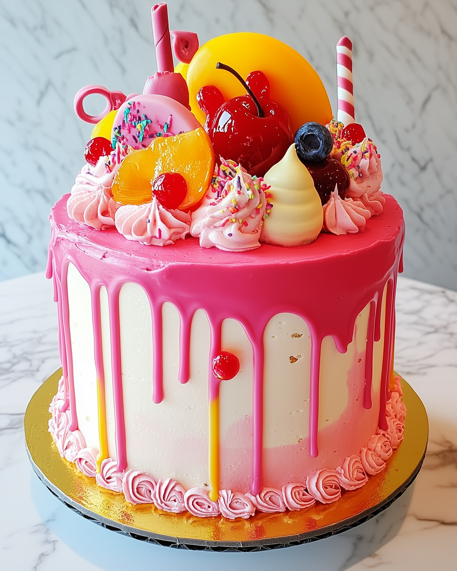 Vibrant cake with pink drip icing, topped with cherries, blueberries, and peach slices. Festive swirls and sprinkles add a playful touch.