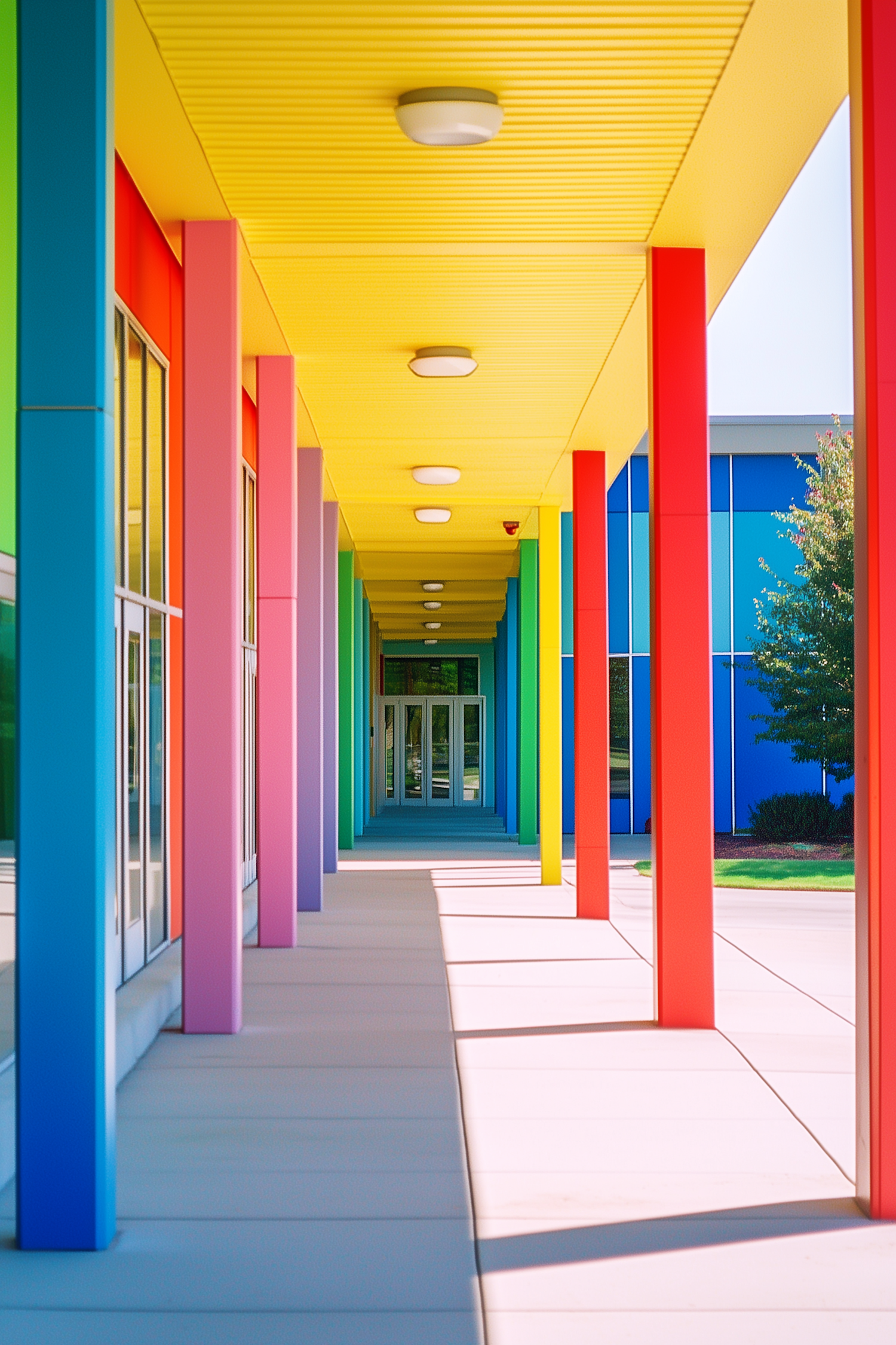 Colorful corridor with rainbow columns and yellow ceiling, creating a vibrant and playful atmosphere. Bright and lively architectural design.