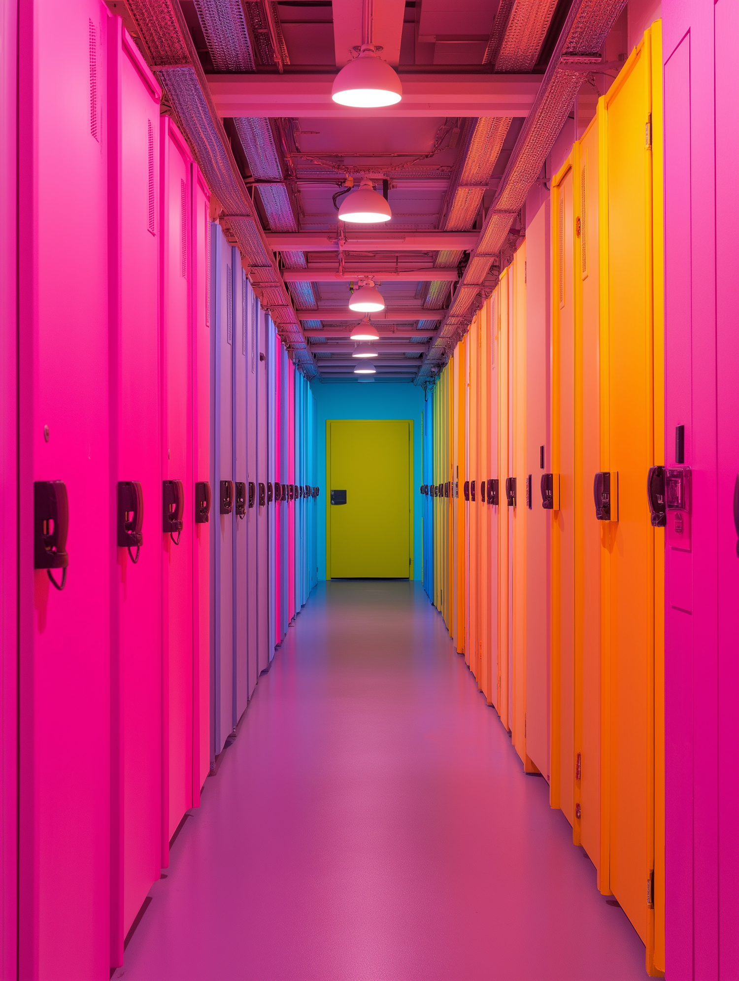 Colorful hallway with vibrant lockers in pink, blue, orange, and yellow, leading to a lime green door. Modern and lively design.