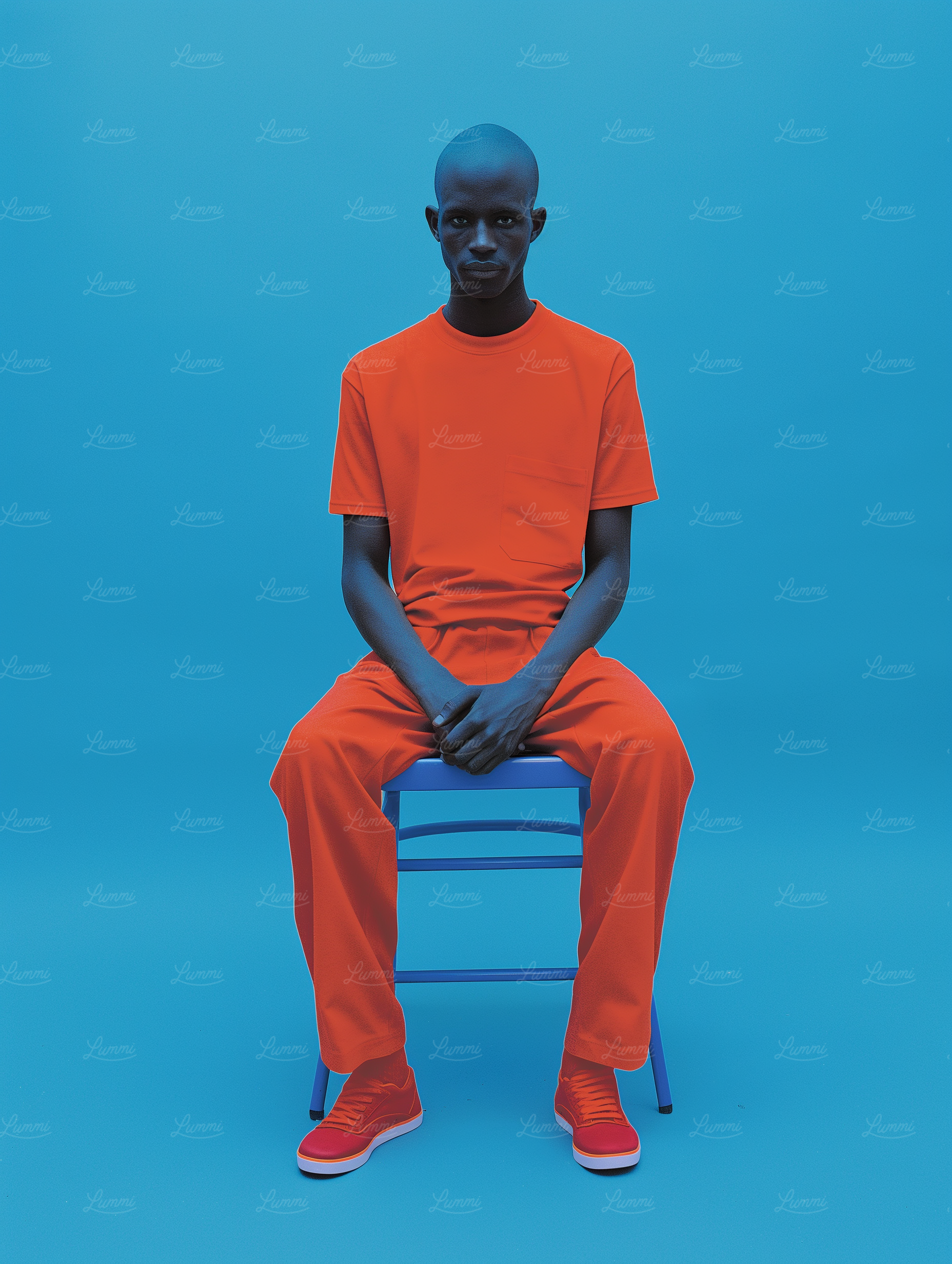Man in bright orange outfit sits on blue chair against a vivid blue background, creating a striking color contrast.