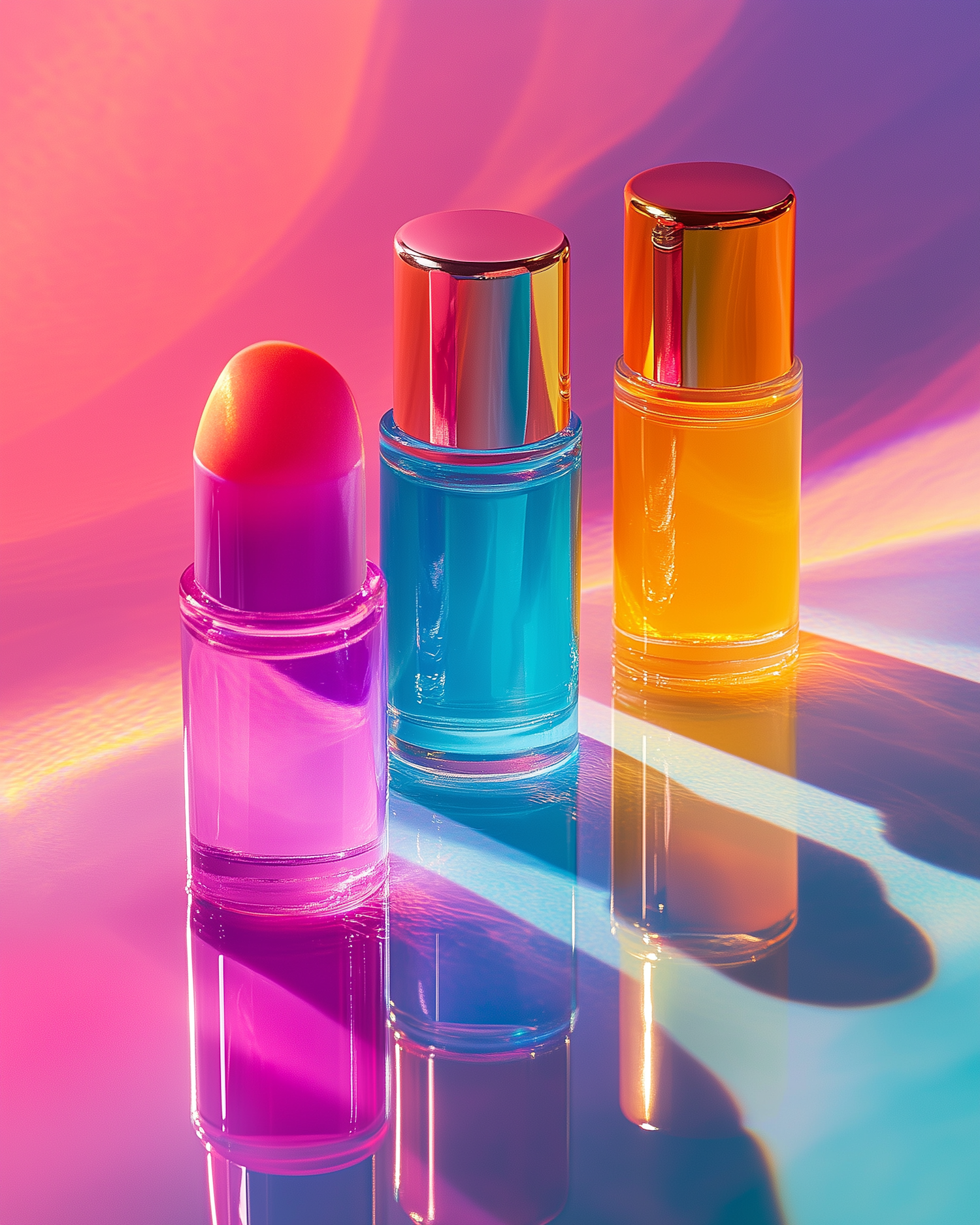 Vibrant cosmetic bottles with colorful liquids and metallic caps on a reflective surface, set against a dreamy pink and orange background.