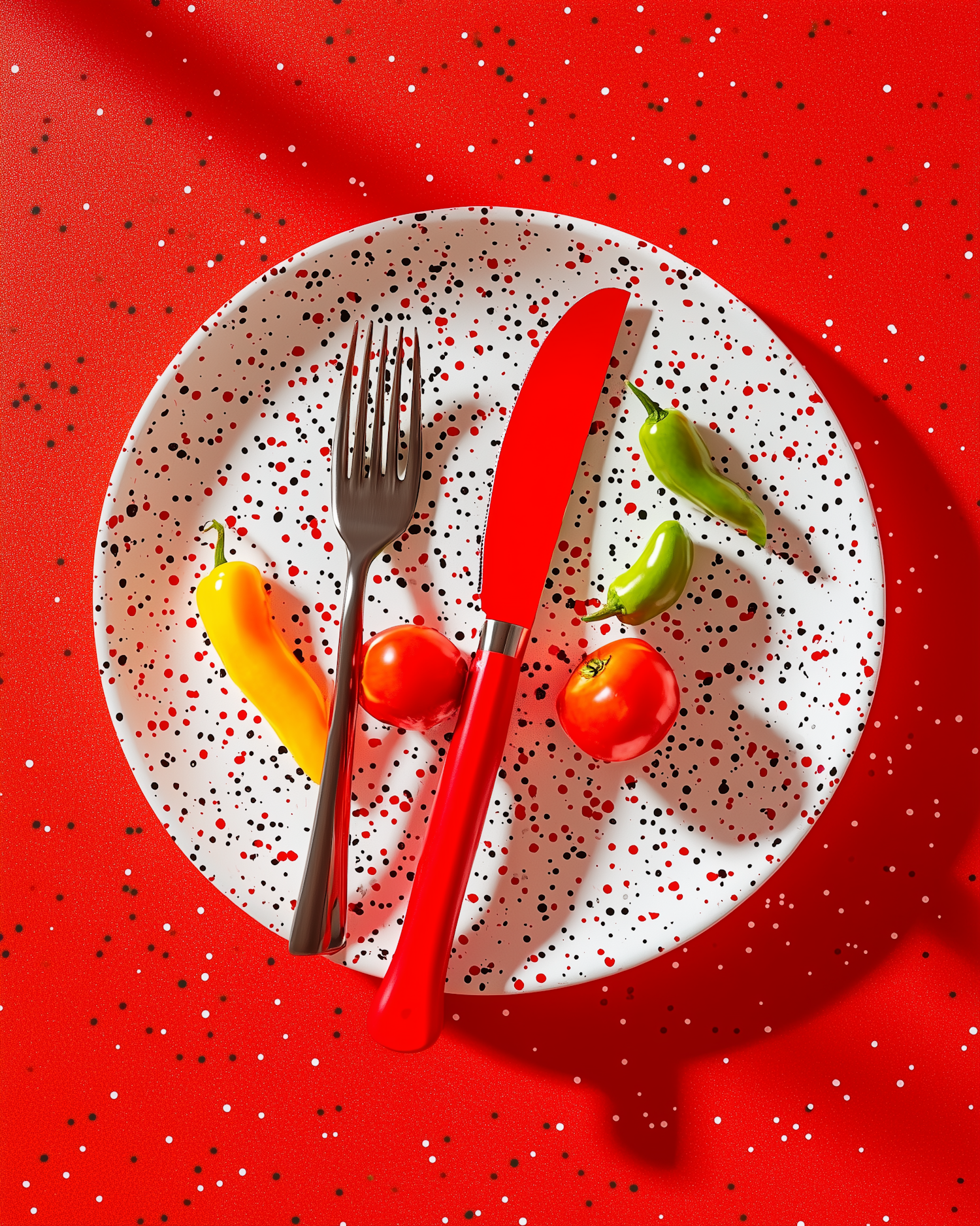 Colorful speckled plate with vegetables and cutlery on a vibrant red background, creating a bold and artistic dining scene.