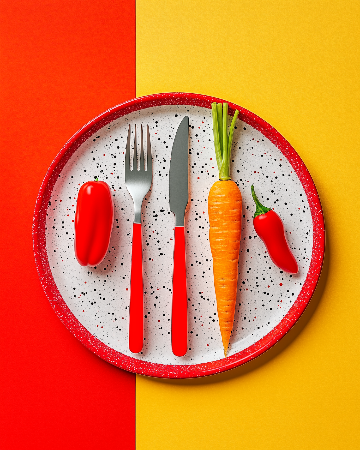 Colorful plate with red pepper, carrot, and chili on a vibrant red and yellow background.