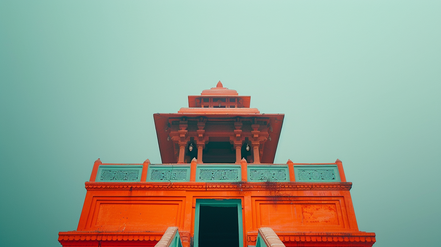 Vibrant orange temple against a turquoise sky, showcasing intricate architecture and a serene, captivating atmosphere.