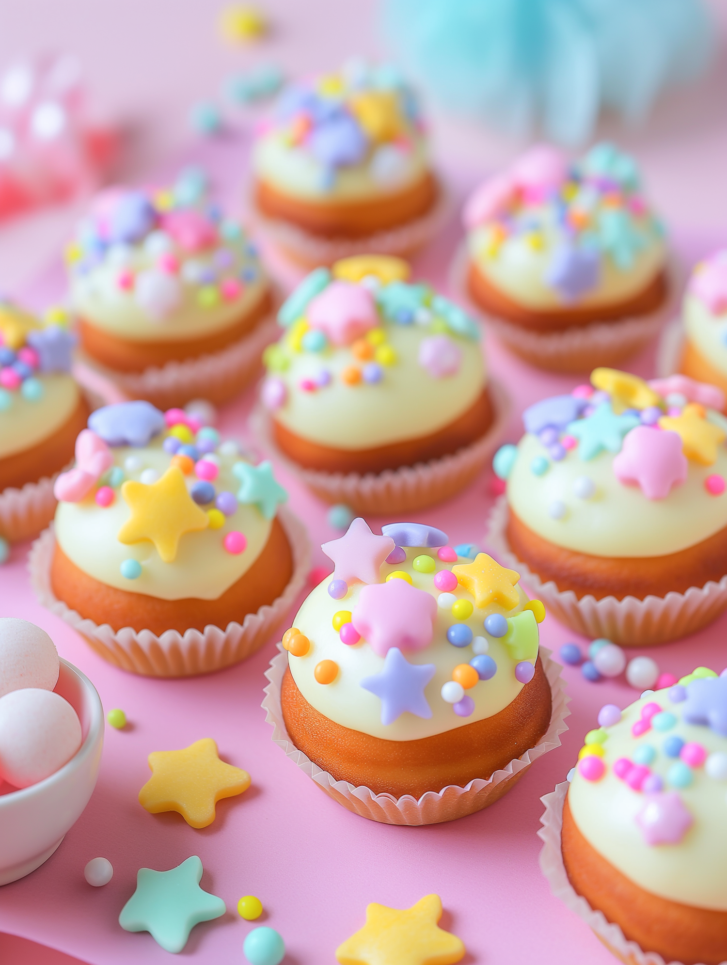 Colorful cupcakes with white frosting, pastel sprinkles, and star-shaped candies on a pink surface. Perfect for festive celebrations.