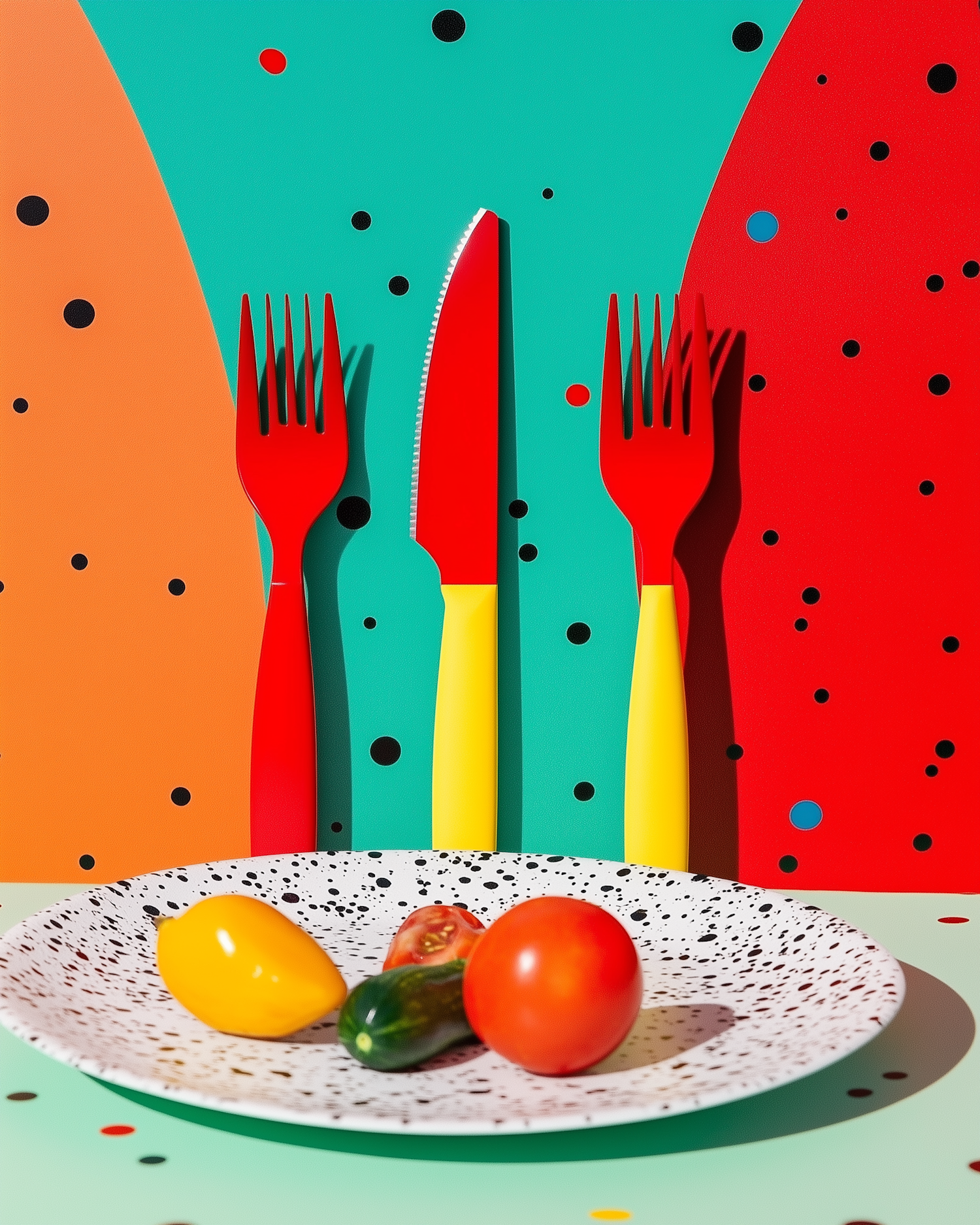 Bright and playful food art with colorful cutlery, fresh vegetables, and a bold geometric polka-dot background.