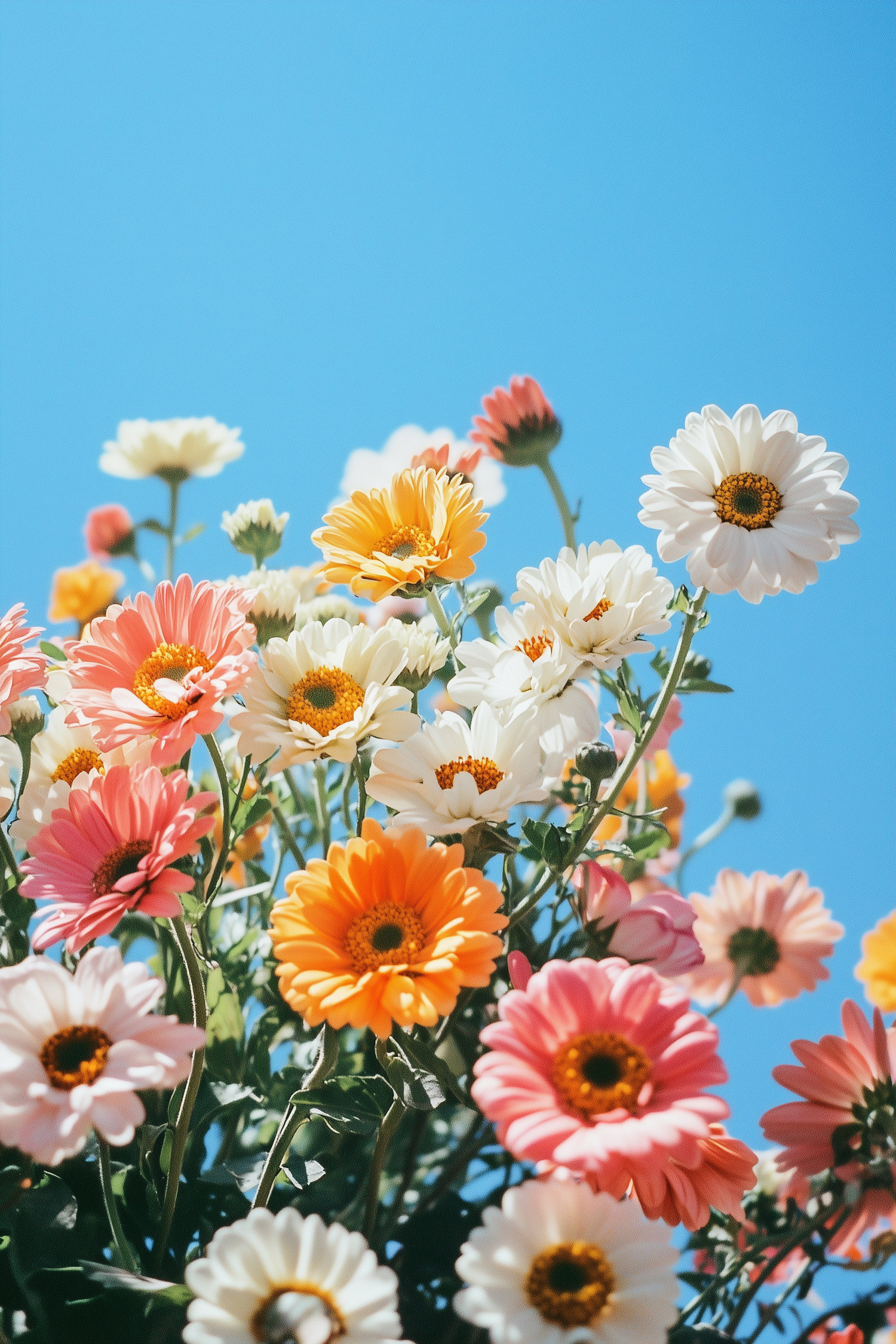 Bright daisies in white, yellow, orange, and pink bloom against a clear blue sky, creating a cheerful and vibrant scene.