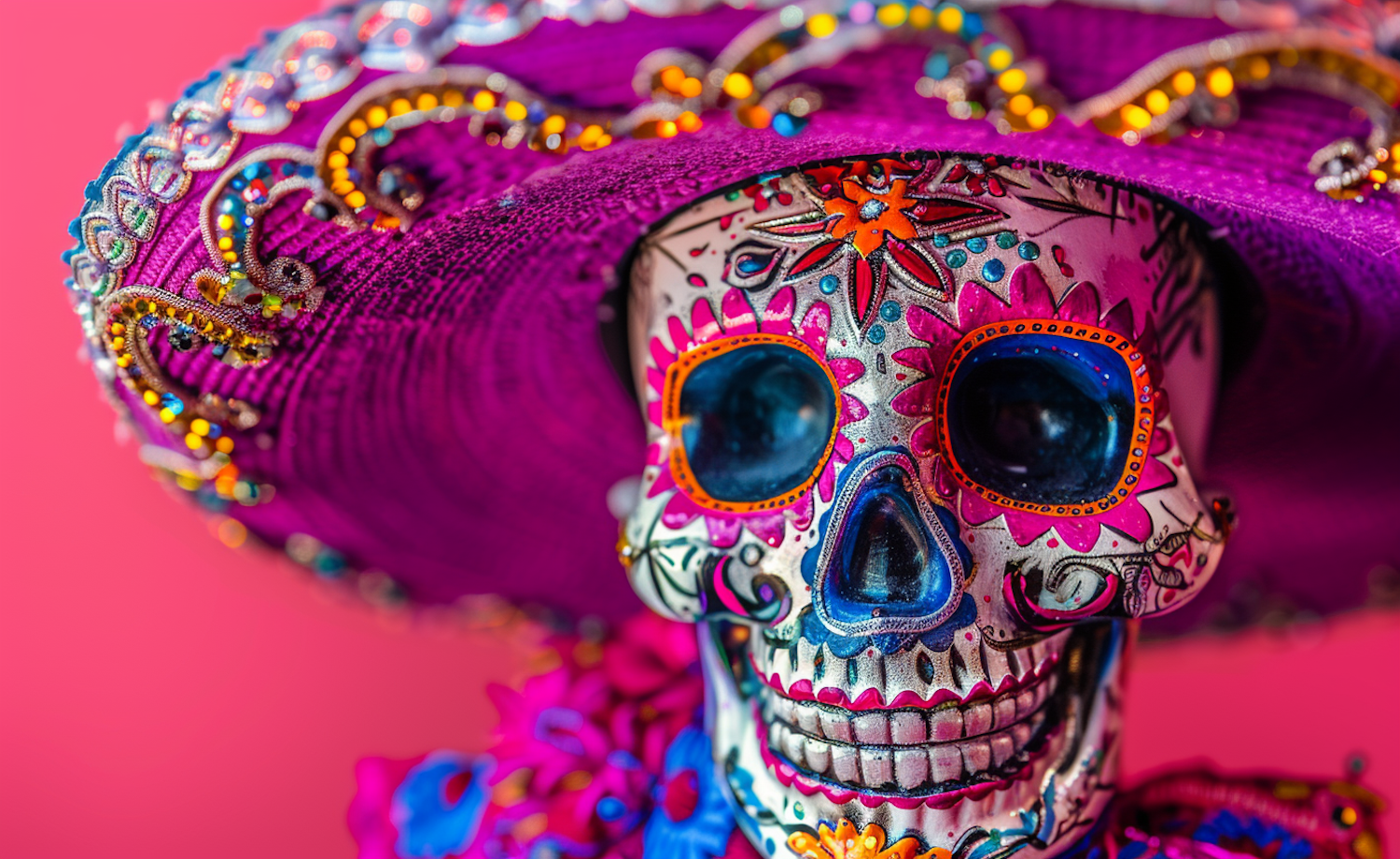 Colorful Day of the Dead skull with floral designs and a purple sombrero, set against a pink background.