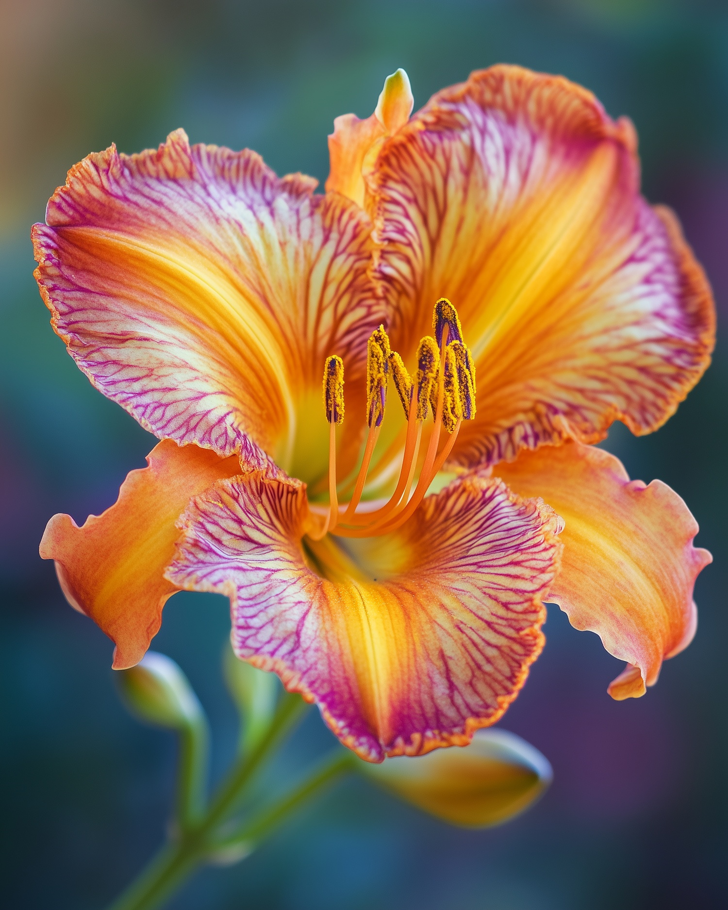 Close-up of a vibrant daylily with orange petals and purple veins, highlighting its intricate details and vivid colors.