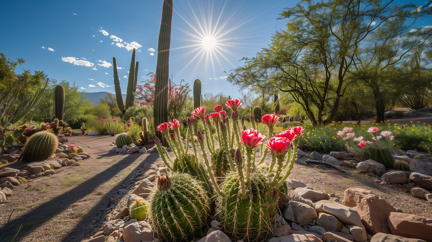 Sunlit desert garden with blooming cacti and vibrant flowers under a clear blue sky, creating a serene and picturesque landscape.