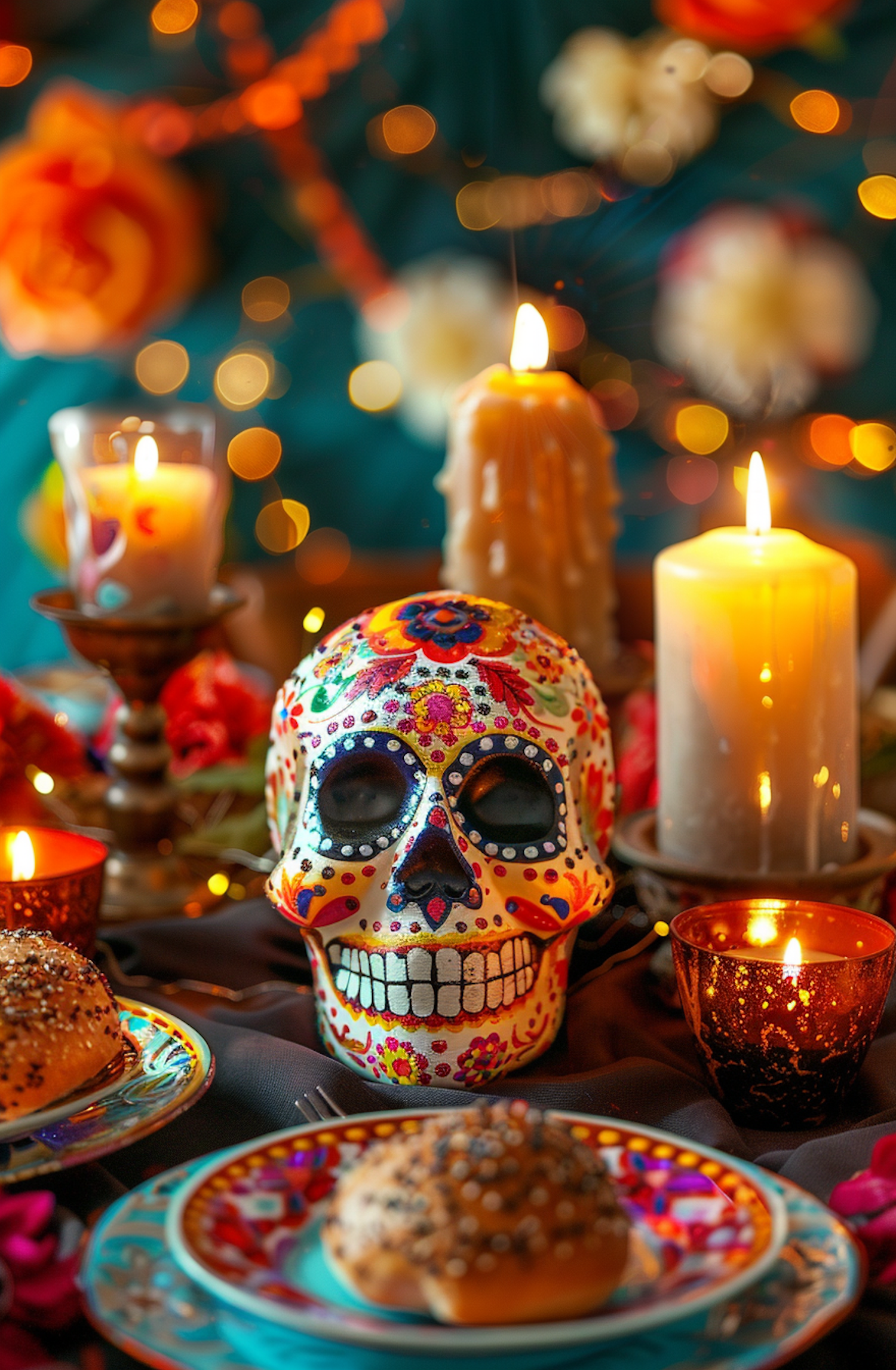 Colorful sugar skull with candles and pastries, creating a festive and warm atmosphere with floral patterns and twinkling lights.