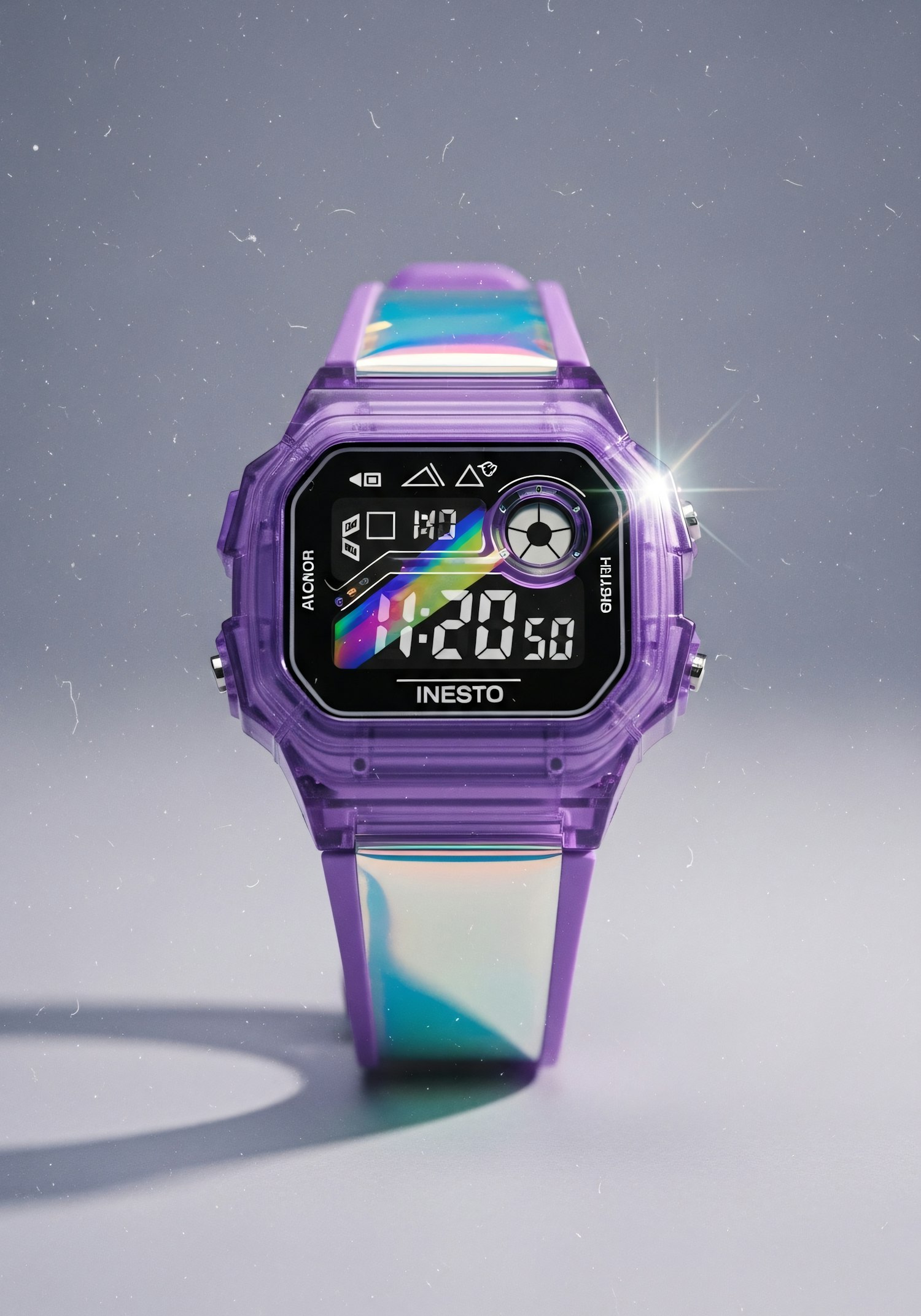 A stylish digital watch with a purple translucent case and a rainbow-accented display, set against a soft gradient background.