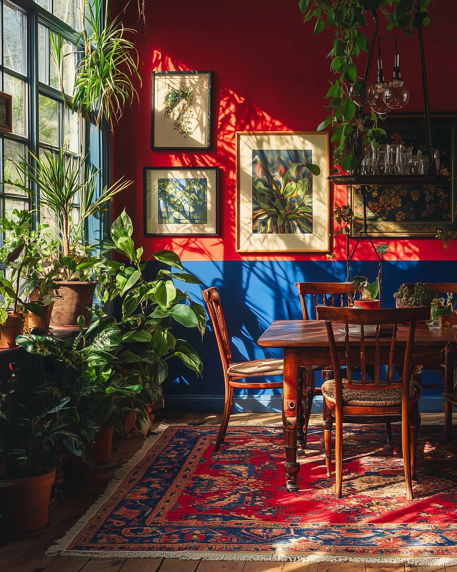 Sunlit dining room with bold red and blue walls, lush plants, a Persian rug, and wooden furniture for a cozy, nature-inspired vibe.