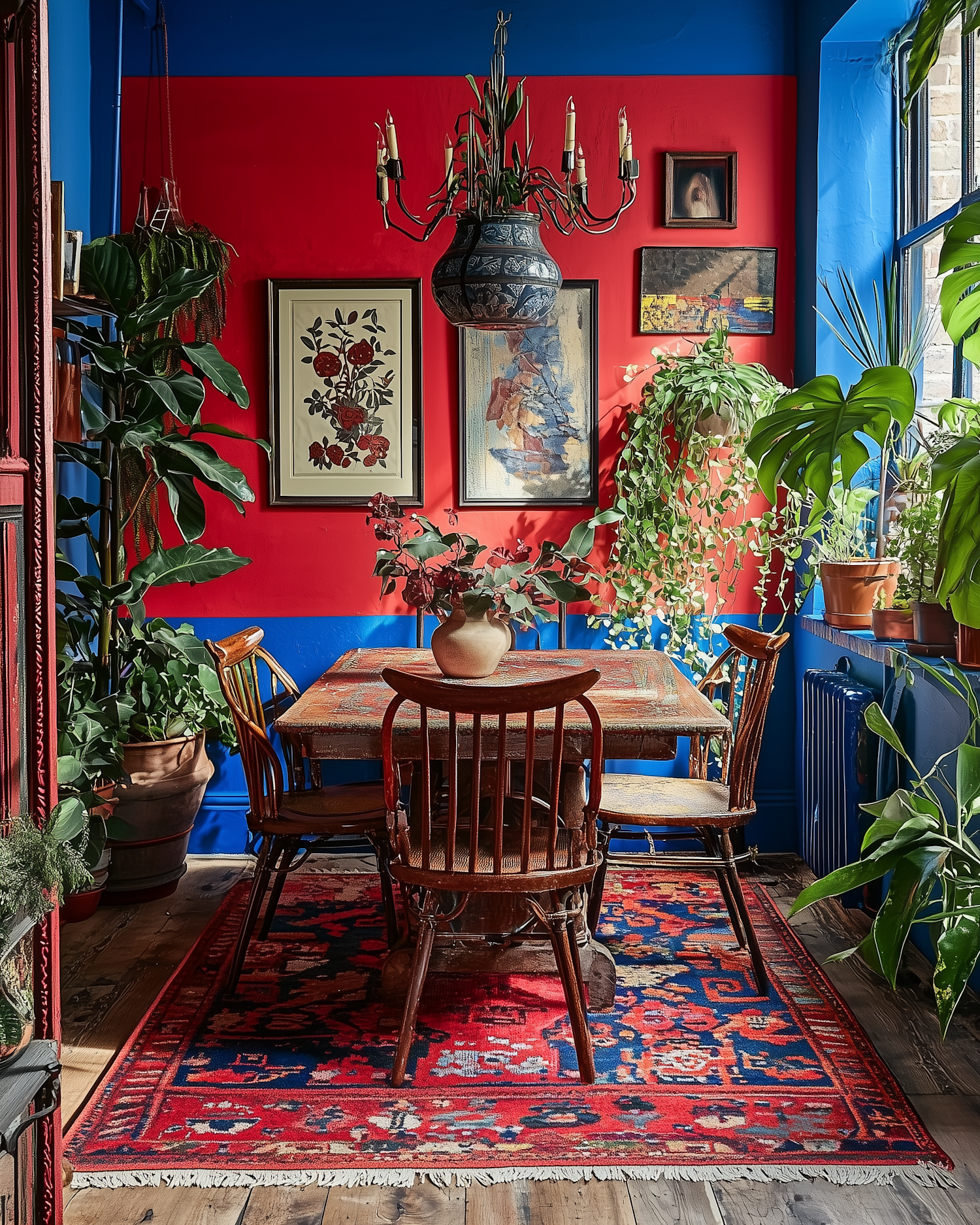 Eclectic dining room with bold red and blue walls, rustic furniture, lush plants, and a Persian-style rug. Perfect mix of cozy and vibrant.