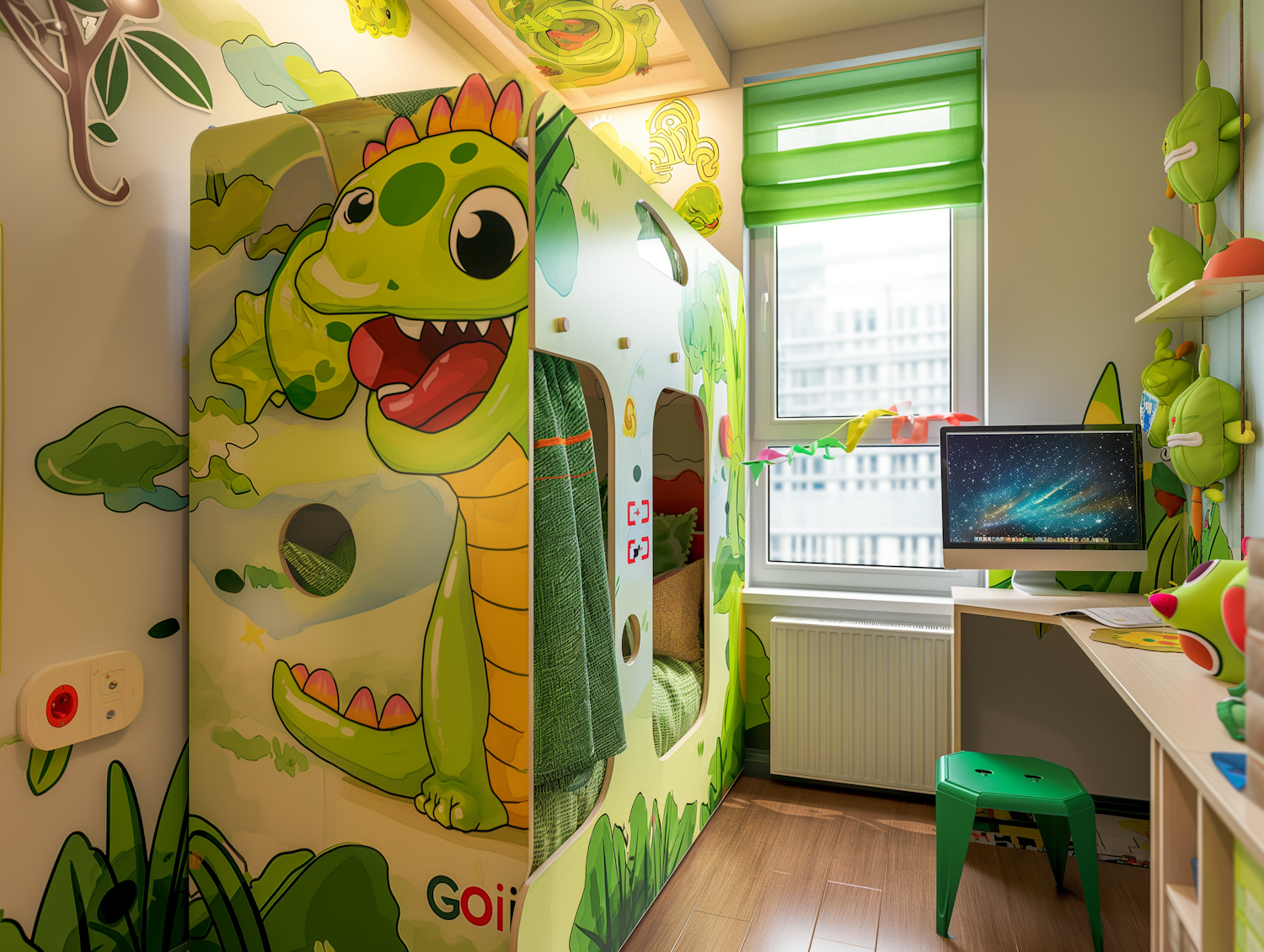 Colorful dinosaur-themed children's room with bunk bed, computer desk, and playful decor. Bright and imaginative space for kids.