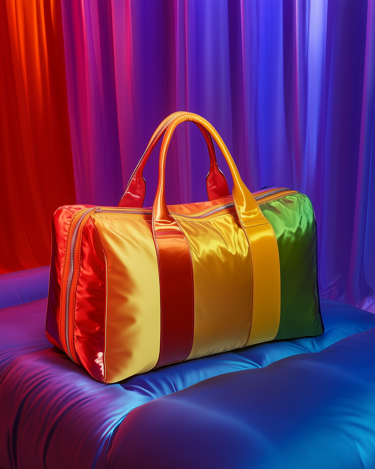 Vibrant rainbow-striped duffel bag against colorful drapery, showcasing bold colors and glossy texture.
