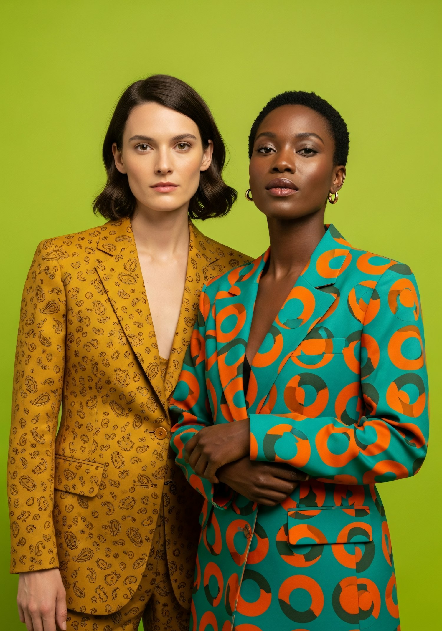 Two women in vibrant patterned blazers pose confidently against a green background, showcasing bold fashion and style.