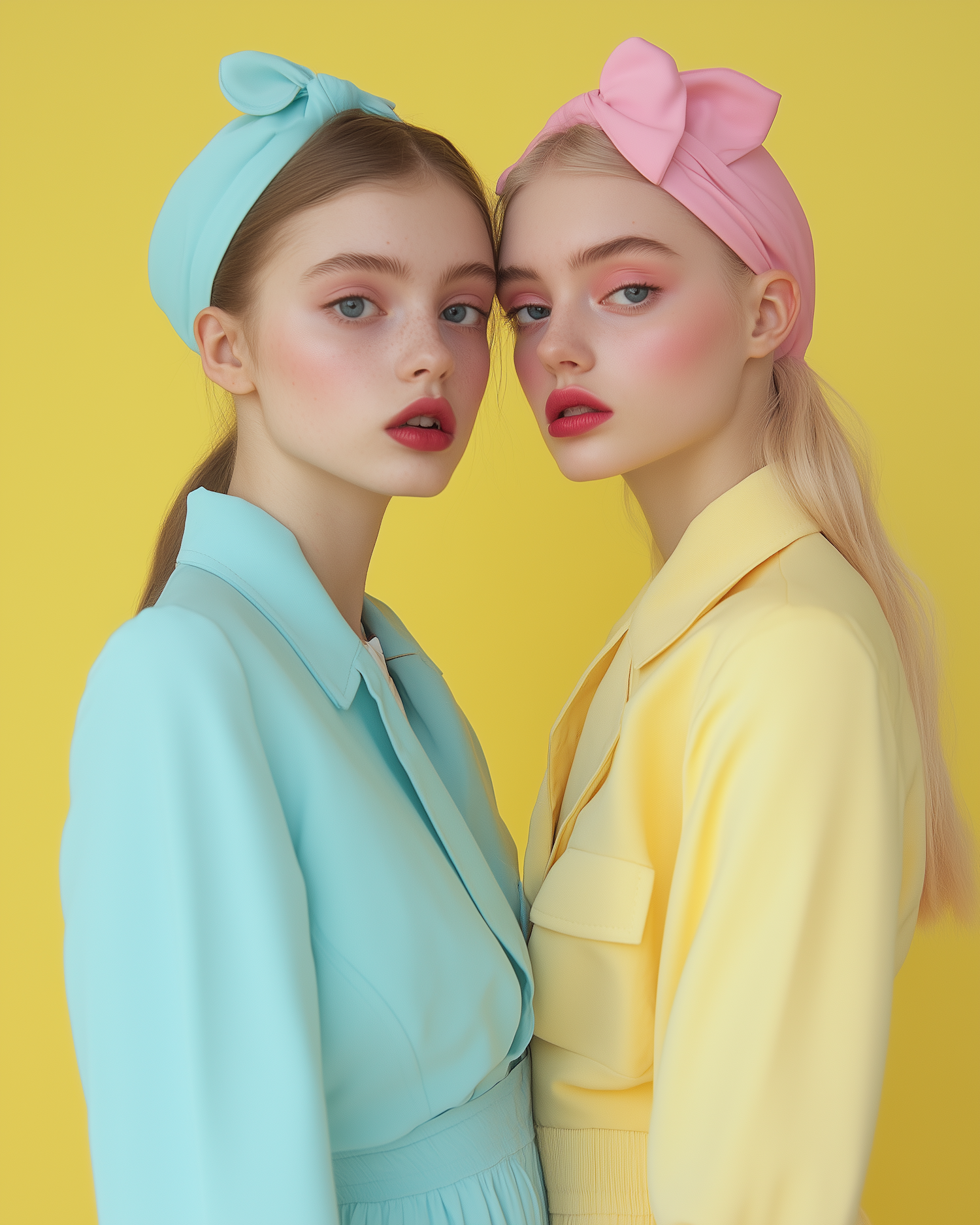 Two women in pastel blue and yellow outfits with matching headbands pose against a vibrant yellow background, creating a bold color contrast.