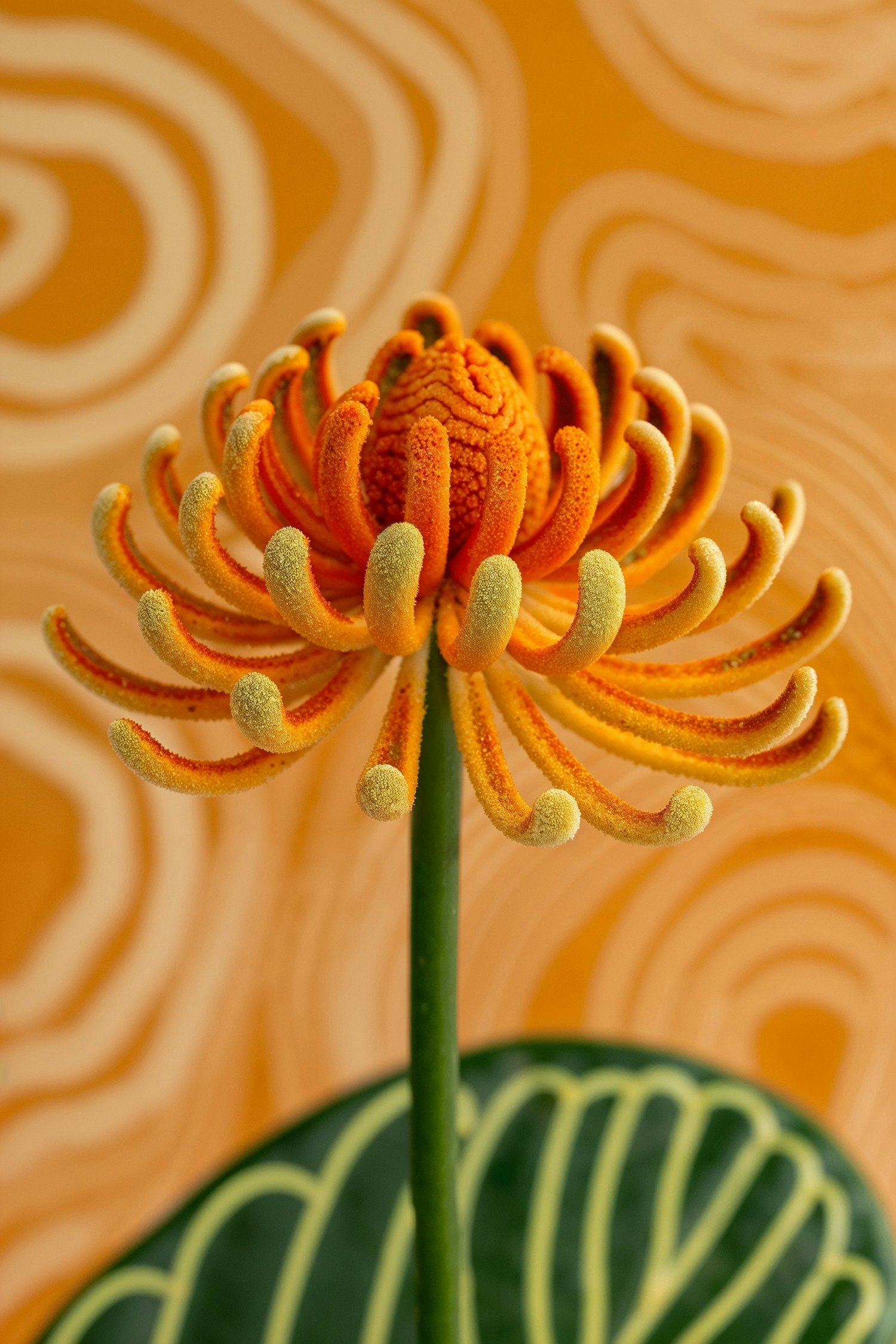 Vibrant orange flower with curled petals against a warm, abstract background. Striking color gradient and intricate design.