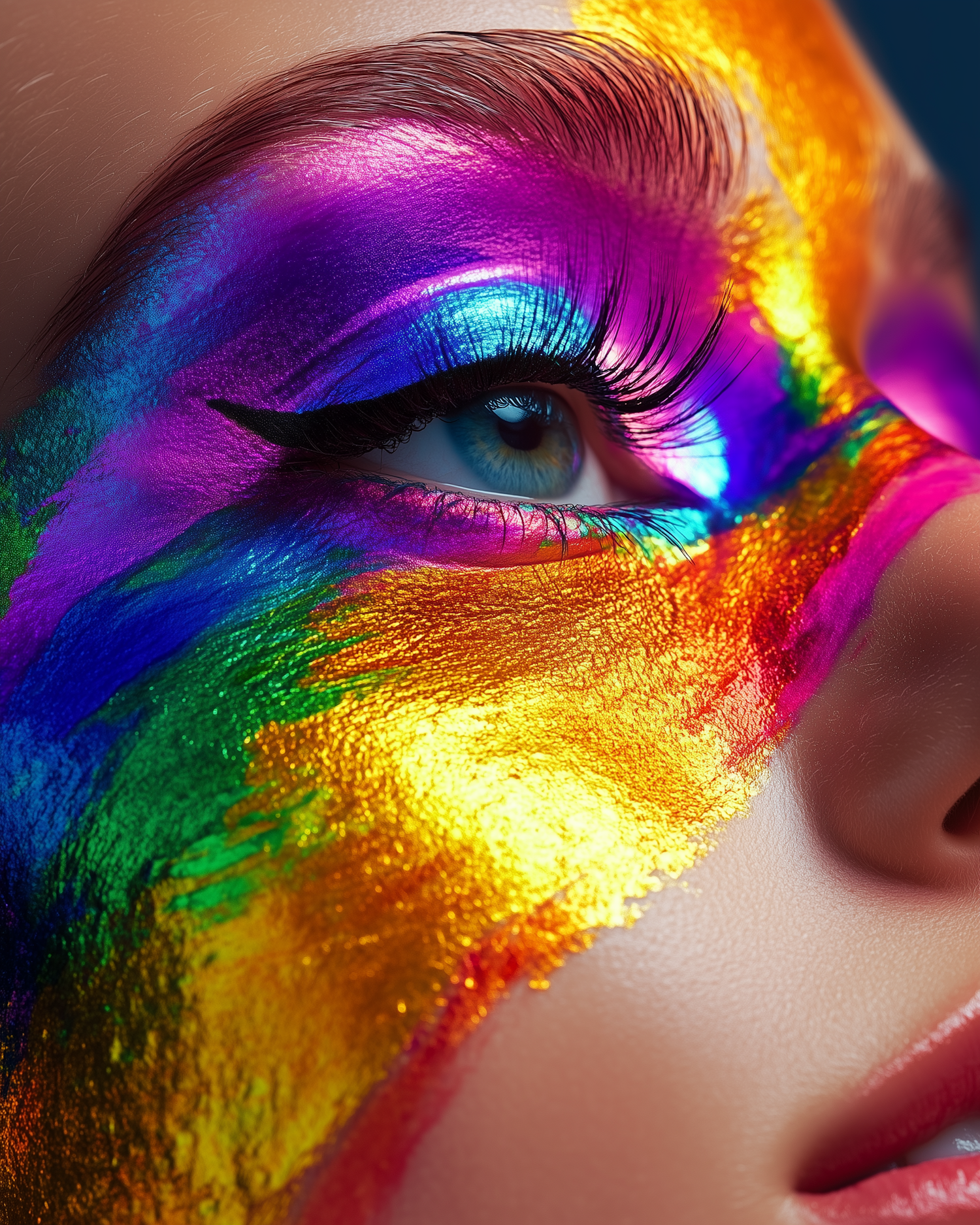 Close-up of a blue eye with vibrant rainbow makeup, featuring metallic gold, purple, blue, and green hues for a striking artistic look.