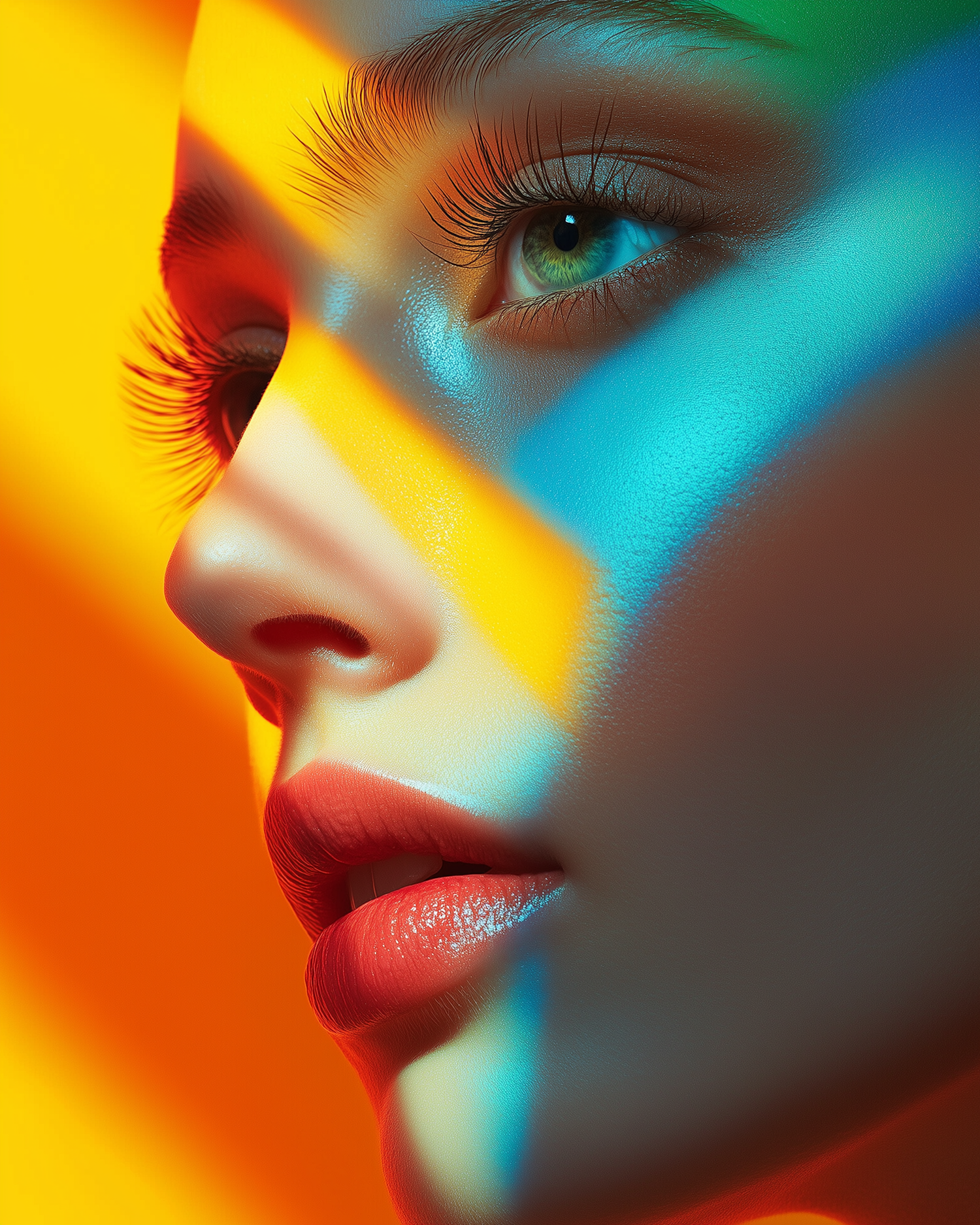 Close-up of a woman's face with vibrant lighting casting colorful hues across her skin, highlighting her green eyes and glossy red lips.