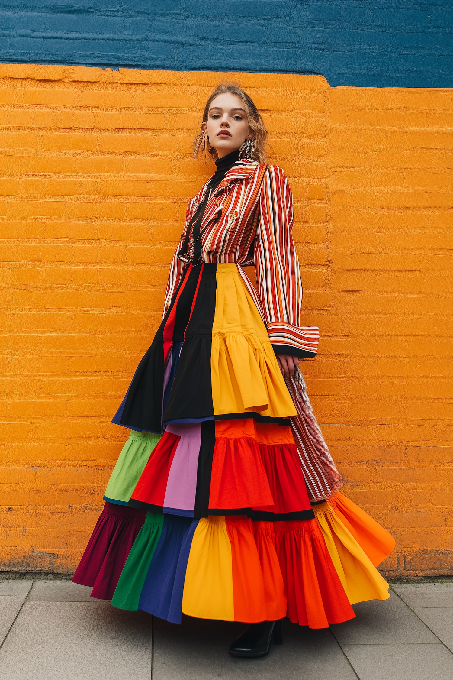 Fashionable woman in a colorful tiered skirt and striped blouse poses against a vibrant orange and blue wall.