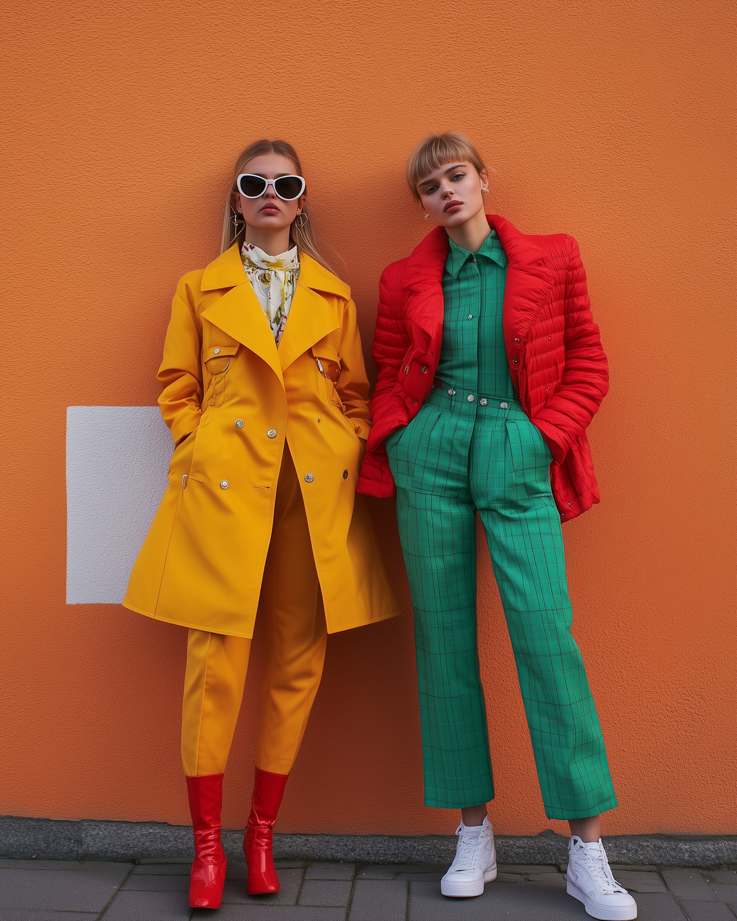 Two stylish women in bold yellow and red outfits pose against a vibrant orange wall, showcasing modern fashion trends.