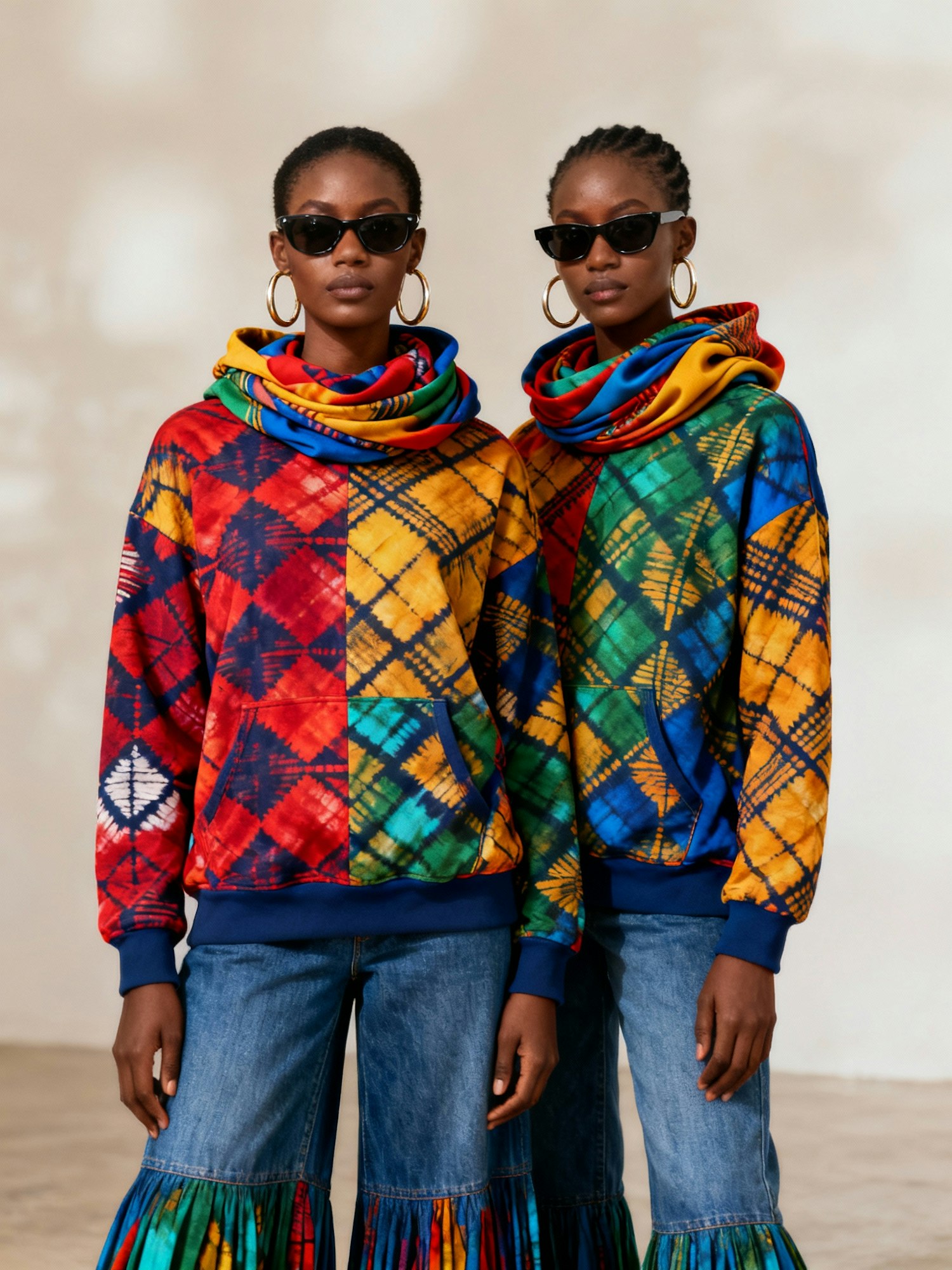 Half -body, high-definition editorial portrait of two Black woman standing confidently against a soft, light-toned background. She wears a vibrant,2 two-toned Adire fabric hoodie layered with cultural significance, paired with sleek sunglasses that add a modern, urban edge, and a pair of palazzo jeans. Her head is wrapped in a sculptural jersey scarf, framing her face with elegance and strength. Bold, oversized hoop earrings accentuate her regal presence, blending street style with ancestral grace. The composition is minimalist yet expressive, with soft lighting that highlights the textures of her garments and the intensity of her gaze. The overall mood is contemporary, culturally rich, and unapologetically stylish—celebrating heritage through a casual, fashion-forward lens.