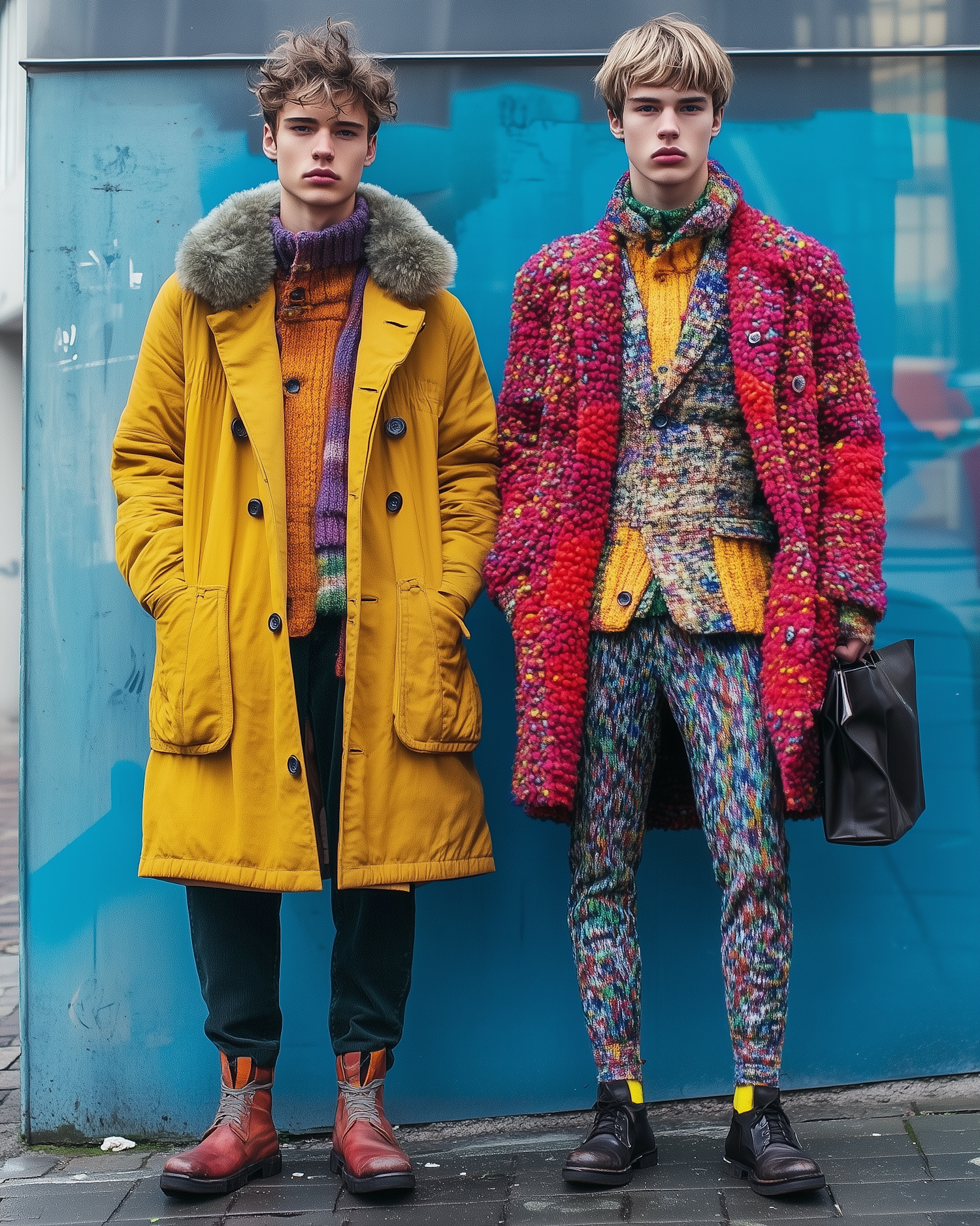 Two stylish men in vibrant, colorful winter outfits pose against a blue backdrop, showcasing bold fashion choices.