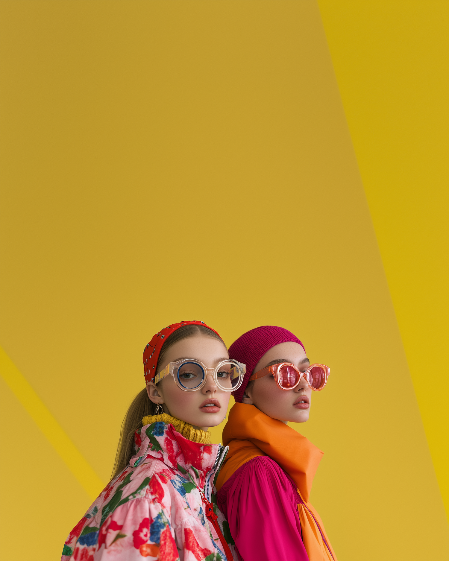 Two stylish women in vibrant outfits and sunglasses pose against a bold yellow background, showcasing modern fashion trends.