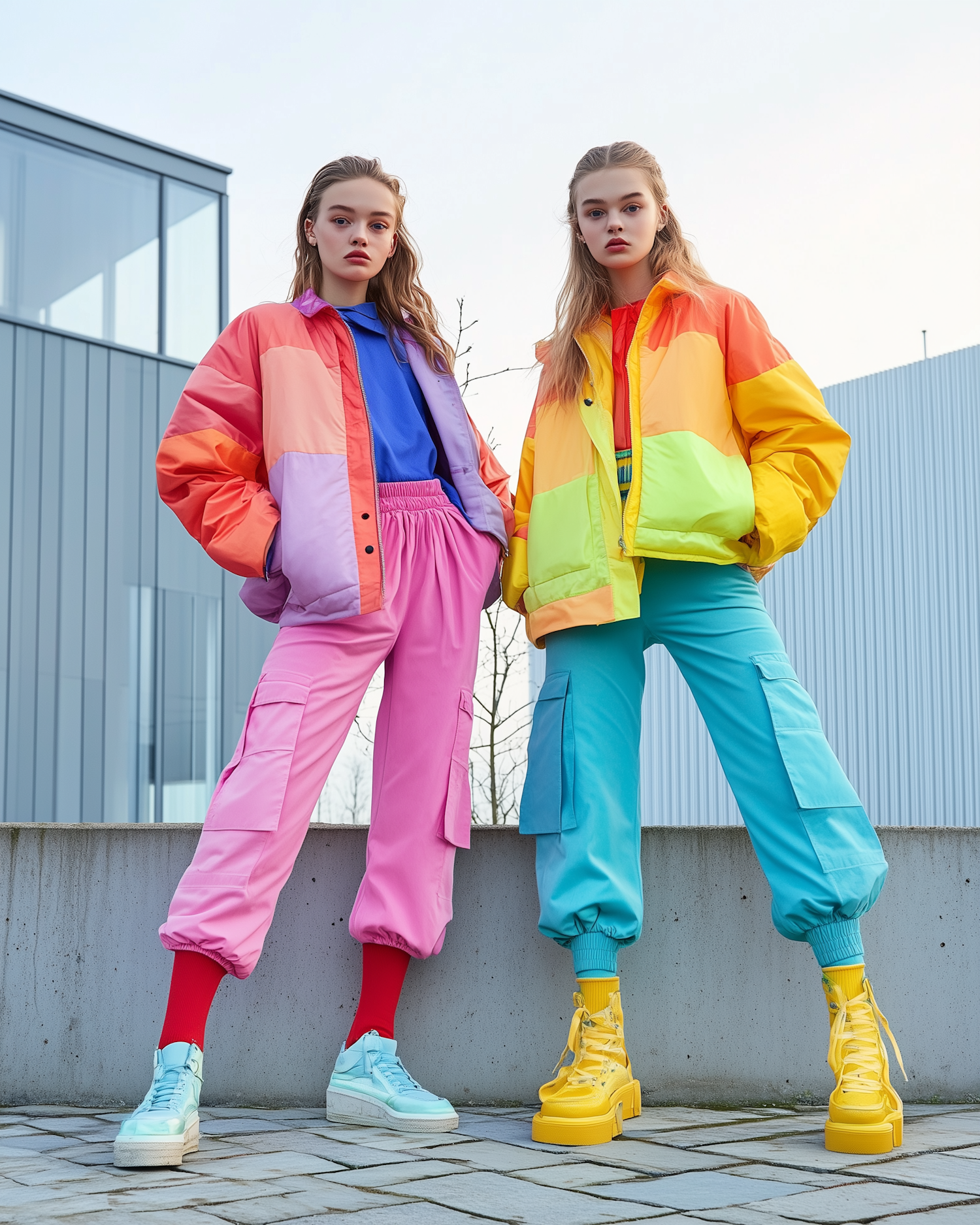 Two young women in vibrant, colorful outfits pose confidently in a modern urban setting, showcasing bold fashion choices.