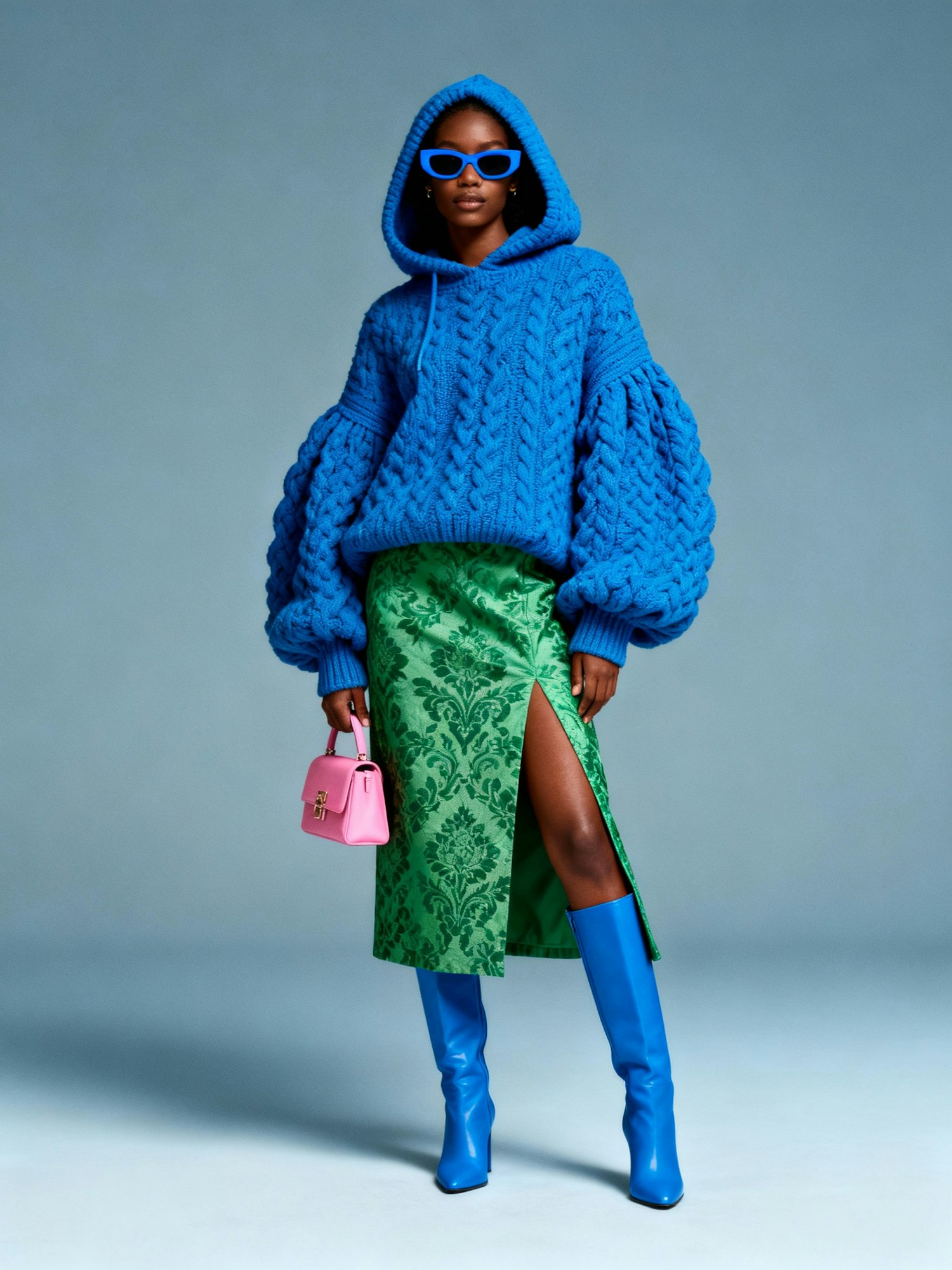 A confident woman standing against a plain soft gray-blue background that complements her warm brown skin tone and the vibrant tones of her outfit. She wears a textured oversized blue hooded sweater with voluminous sleeves, paired with a green brocade skirt featuring a front slit and matching blue knee-high boots. Accessories include blue sunglasses and a small pink handbag. The look blends vibrant color blocking, rich texture play, and avant-garde streetwear styling in a bold editorial composition.