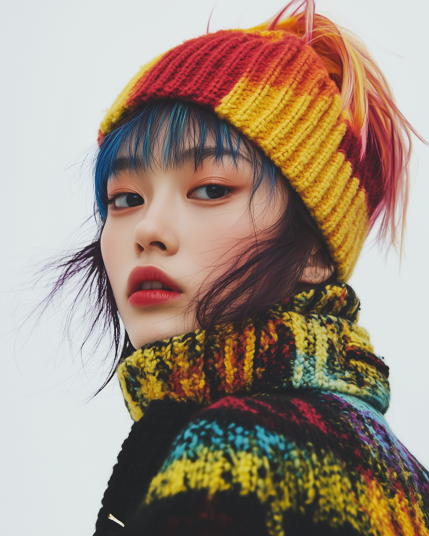 Asian woman with blue hair in a colorful knitted hat and sweater, exuding confidence and style against a neutral background.