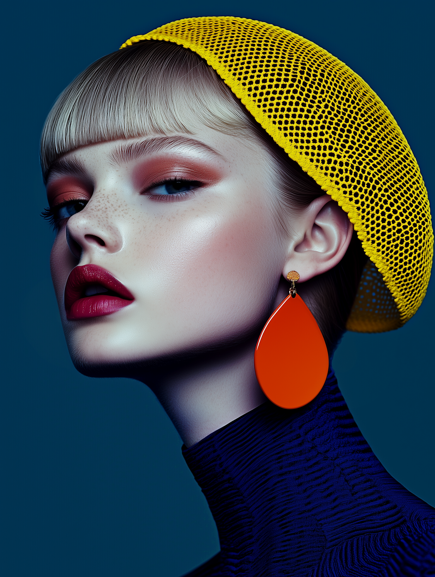 Bold portrait of a woman with vibrant makeup, orange earring, and yellow headband against a teal background.