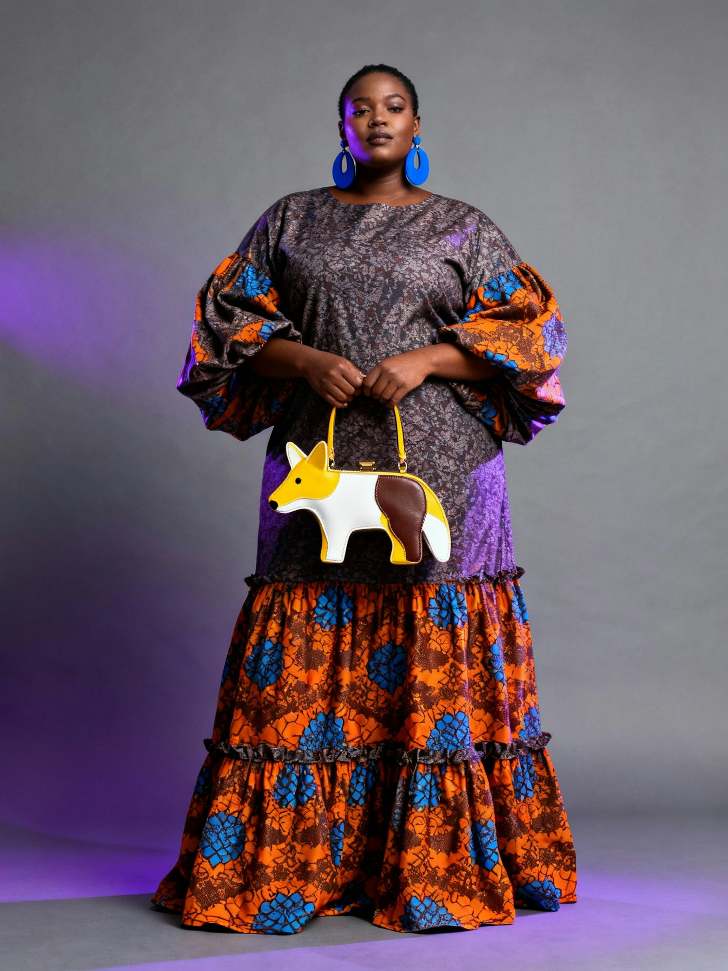 Full-body, high-definition portrait of a Black chubby woman wearing a long, flowing dress with voluminous sleeves and a tiered skirt. The garment features a vibrant pattern in orange, blue, and brown hues. She accessorizes with large blue earrings and holds a uniquely designed handbag resembling a stylized animal face in yellow, white, and brown. Her expression is calm and poised. The neutral gray background enhances the purple tones of her outfit, making the layered textures stand out. Lighting is soft and directional, casting gentle highlights across her face and garment. The mood is bold, artistic, and editorial—ideal for an Afro-fusion fashion portrait or contemporary identity showcase.