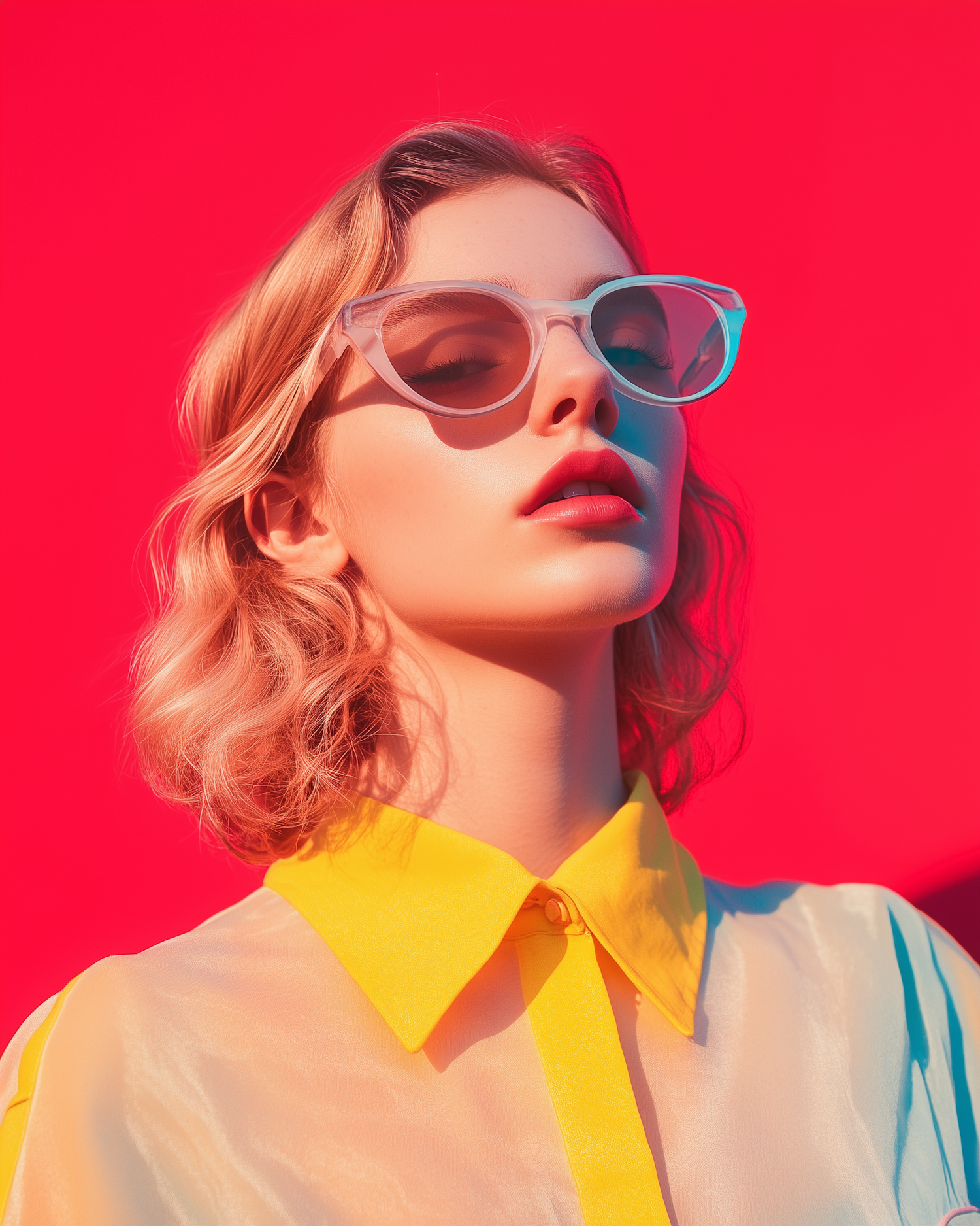 Stylish woman with blonde hair, cat-eye sunglasses, and a yellow blouse poses confidently against a bold red background.