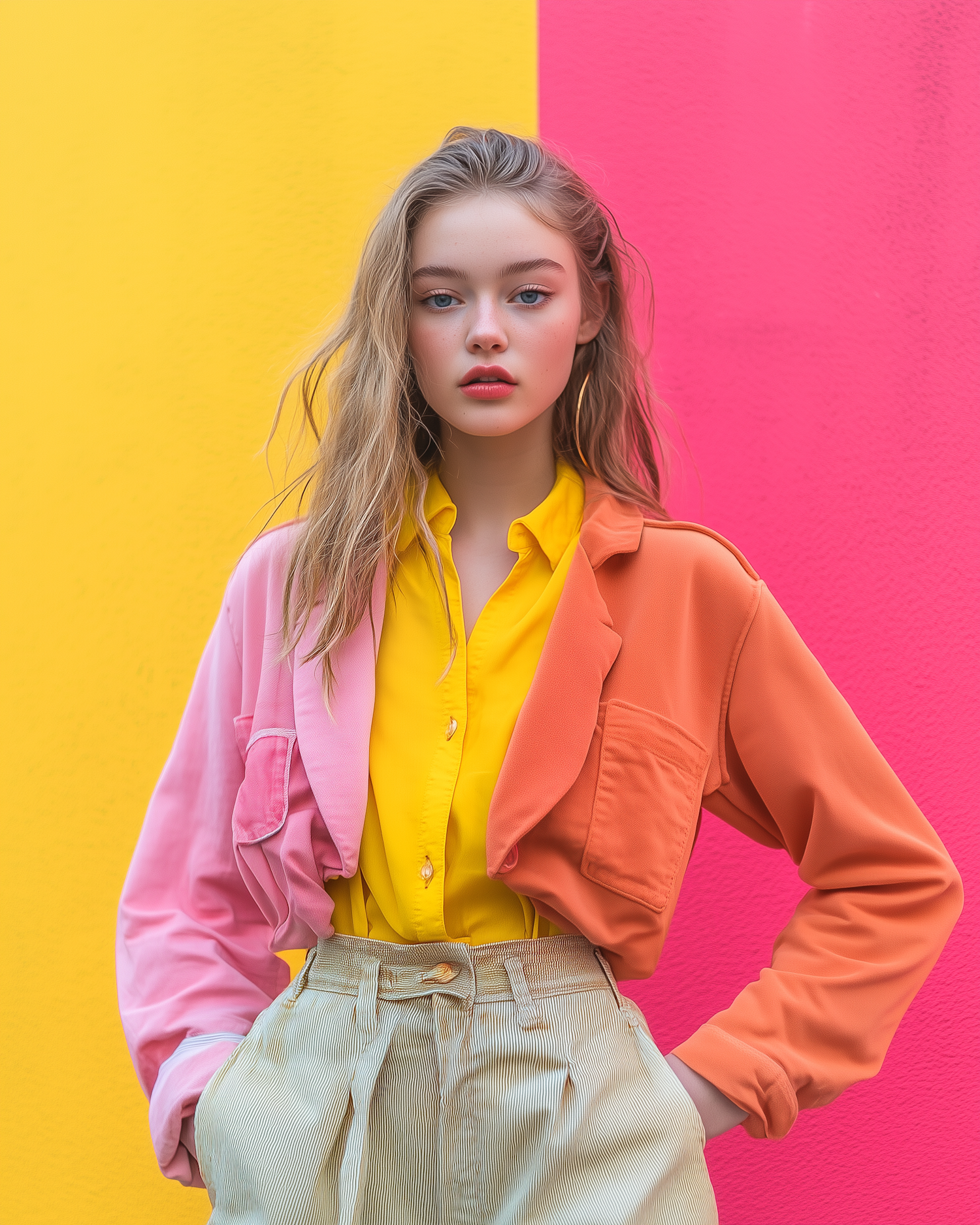 Stylish woman in vibrant yellow, pink, and orange outfit against a colorful background. Fashion-forward and bold aesthetic.