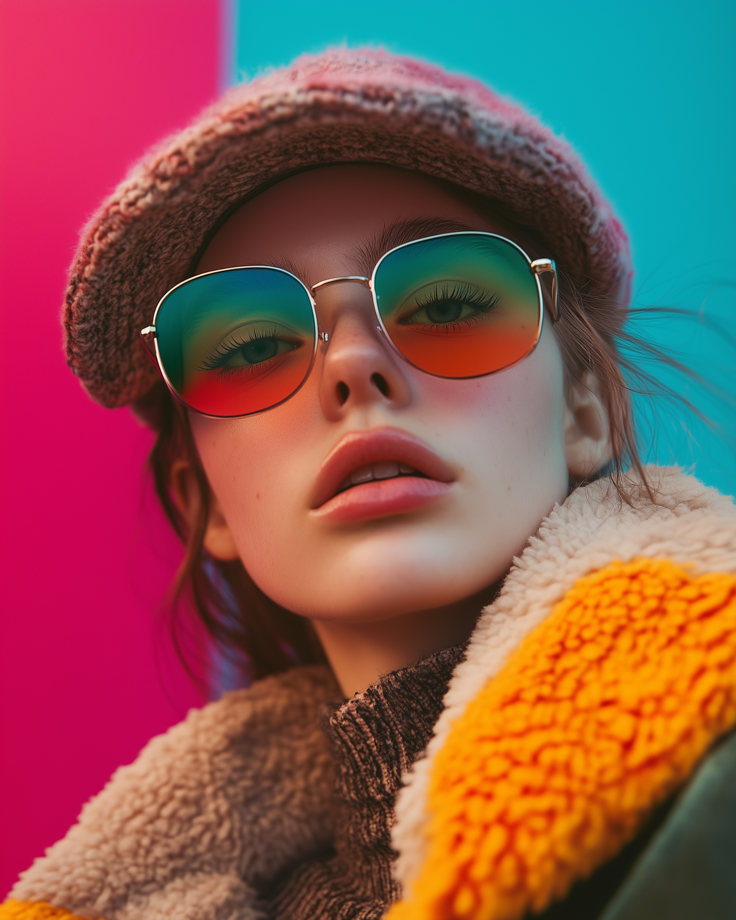 Stylish woman in gradient sunglasses and textured cap against a vibrant pink and teal background, showcasing bold fashion.