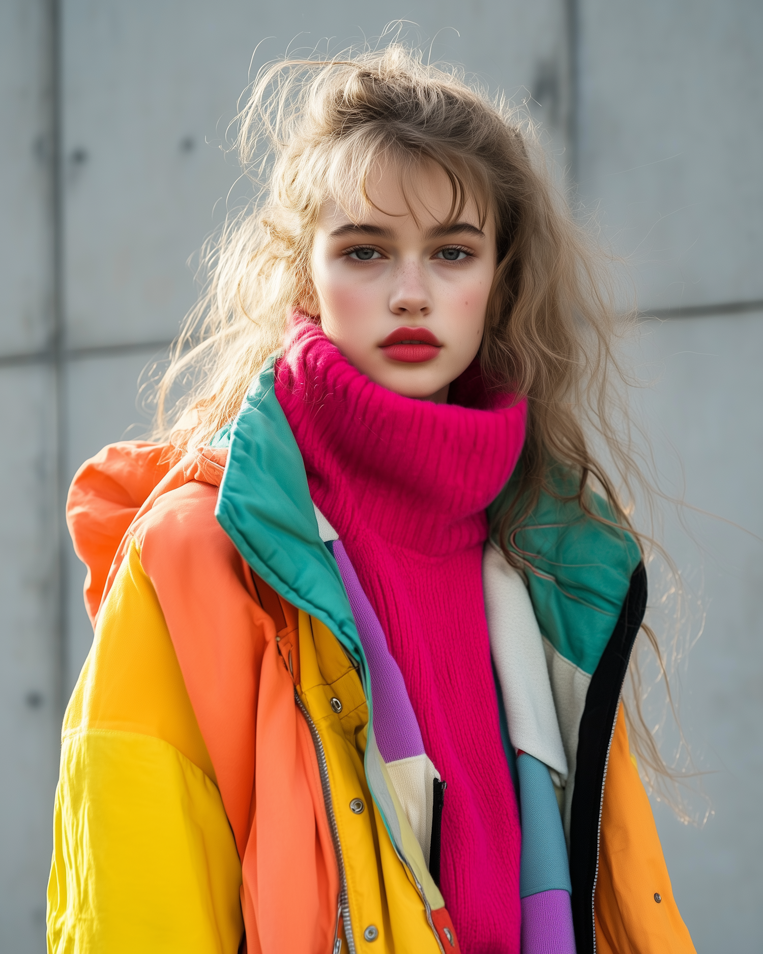 Young woman in a colorful jacket and pink turtleneck, with wavy blonde hair and bold red lips, against a plain background.